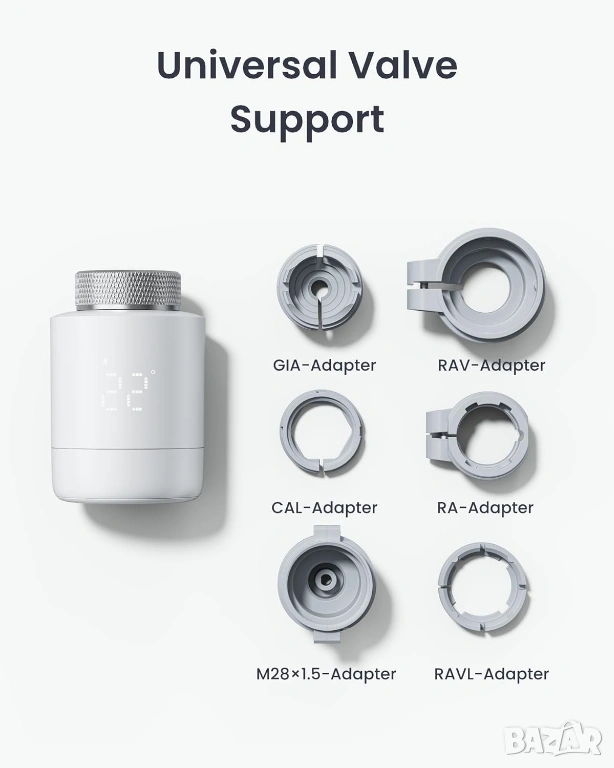 Бърз и лесен монтаж: Не са необходими професионални инструменти или модификации. Просто прикрепете термостата към радиатора си с помощта на металната гайка и следвайте стъпка по стъпка ръководството в приложението, за да го сдвоите. Стандартно се предлага с 6 адаптера (RA, RAV, RAVL, M28x1.5, Giacomini и Caleffi), които са съвместими с повечето радиатори на пазара, без да е необходимо да купувате отделни части.