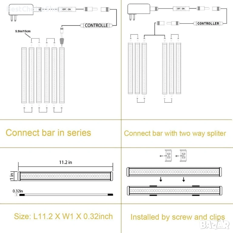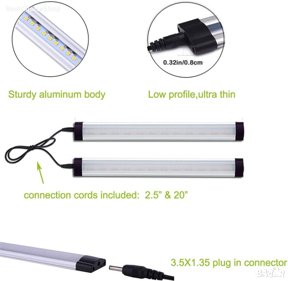 Предвидени са 2 вида свързващи кабели за гъвкав монтаж на осветлението под шкафовете. Единият кабел е 5,9 инча, другият е 20 инча. Широко използвани за осветление на плотове, рафтове, витрини, рафтове и работни плотове.