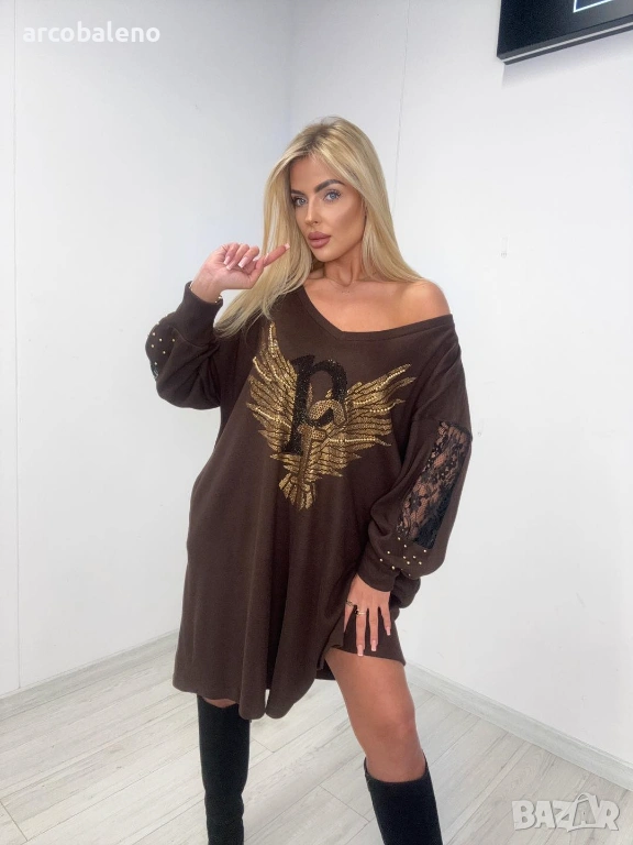 Стилен и удобен овърсайз суитшърт/туника, украсен с впечатляваща апликация със златен орел. С вдлъбнато деколте , тази дреха подчертава женствеността и добавя модерен щрих. Перфектна е като туника с ботуши, клинове или вталени панталони.