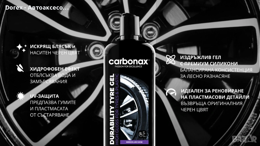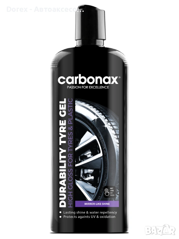 Придайте на автомобила си завършен, професионален вид с гелообразна формула, създадена за интензивен блясък и устойчивост при всякакви атмосферни условия. Carbonax Durability Tyre Gel прониква в повърхността на гумата и пластмасовите детайли, възстановява наситения черен цвят и създава защитен хидрофобен слой.