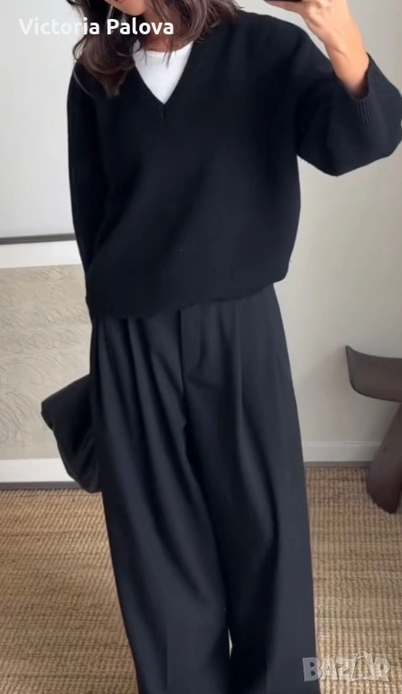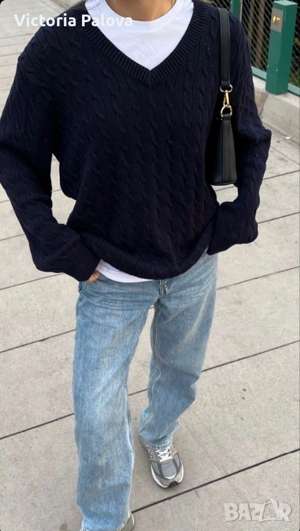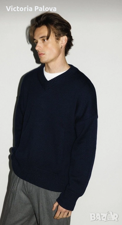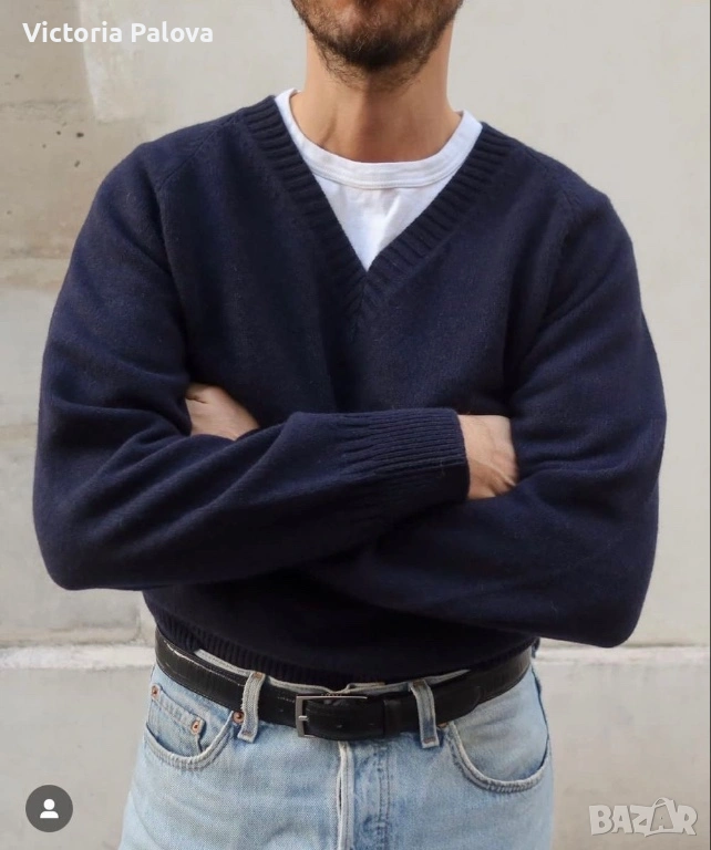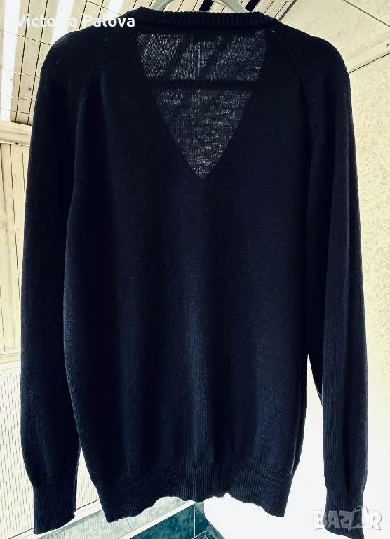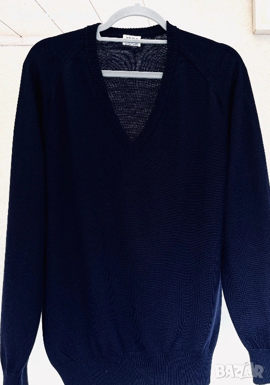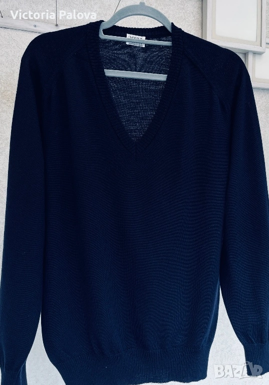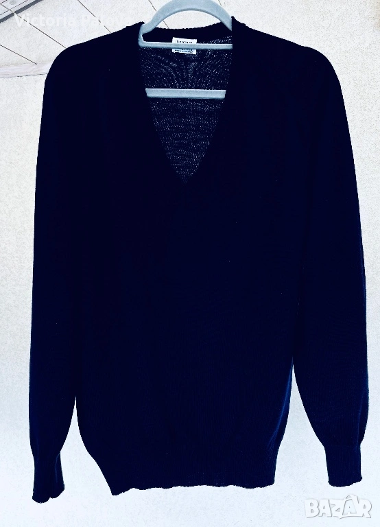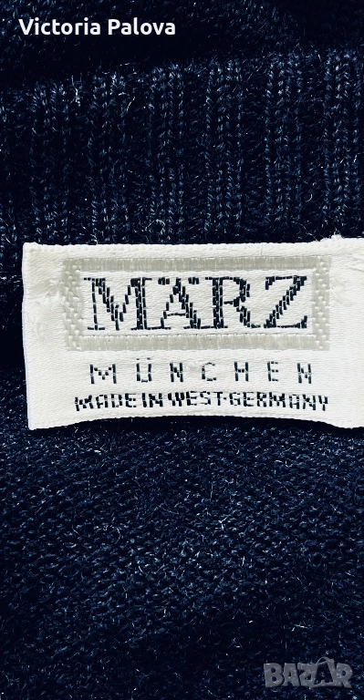 Съкровището на Maerz München – легендарна марка от 1920 г., основана в Мюнхен от Wolfgang März, пионер в премиум плетивата. Започнала в малко ателие, тя еволюира в икона на качеството, мотото ѝ : “Качеството е уважение към клиента”. Този тъмносин до черен пуловер е от Западна Германия: класическо V-деколте, мека луксозна текстура, универсален стил за casual или бизнес. В топ състояние. Реглан, ГО - 61см, дължина - 70см, ръкав от мишница - 51см.