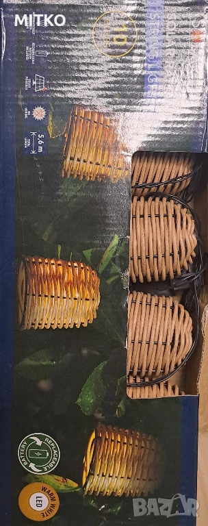 Спецификации: Обща дължина 5.6 метра, включва 10 светодиодни (LED) крушки с топла бяла светлина.