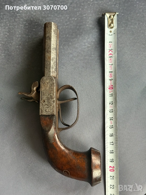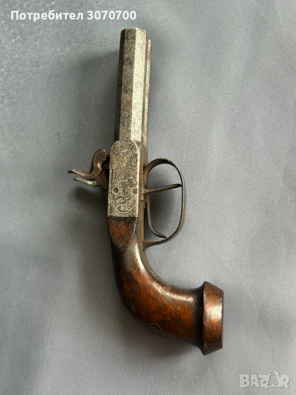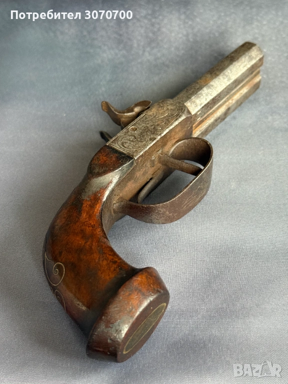Уникален стар двуцевен пищов, сребърни набивки → Обява 53587472