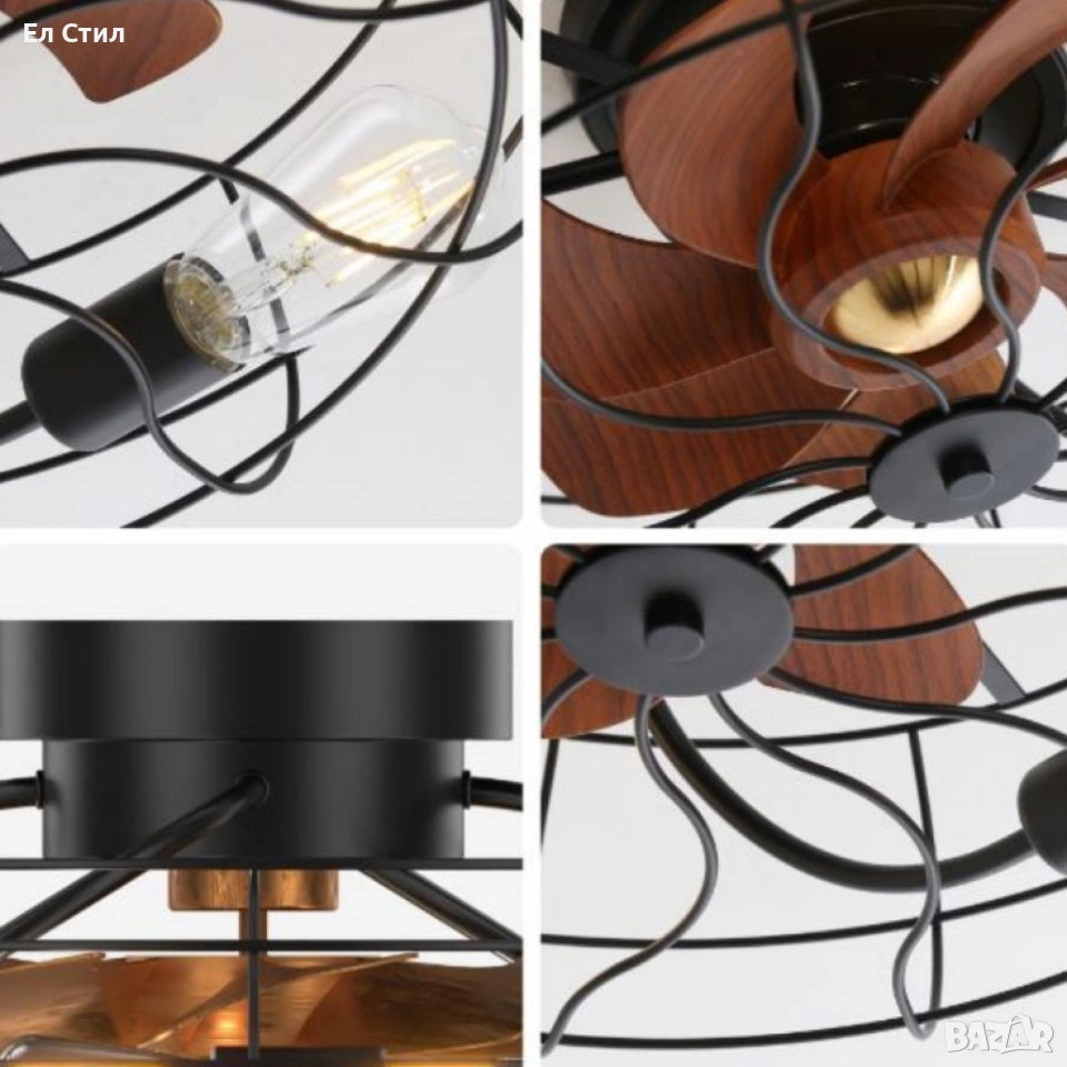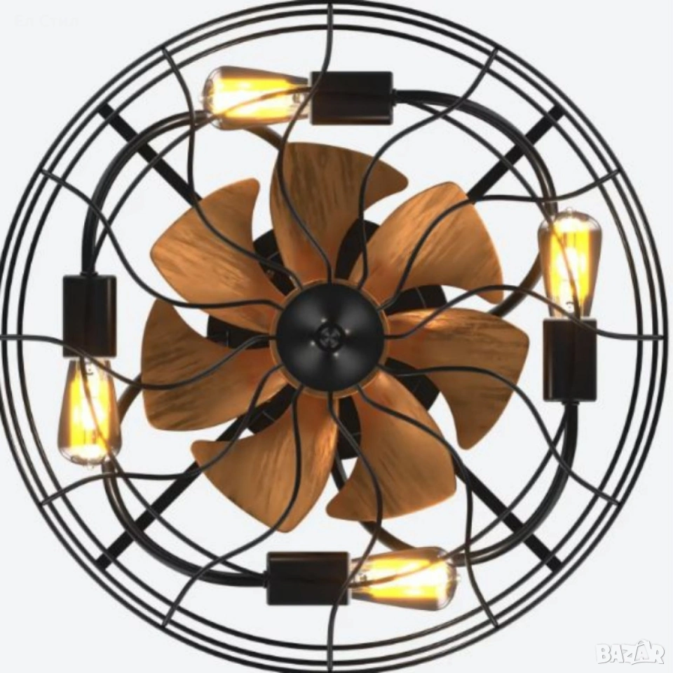 Вентилатор за таван с осветление;Марка: OEM / Индустриален стил;Диаметър: 50 см;Височина: 25 см;Материали: ABS + стомана (Q235);Материал на перките: ABS;Основен цвят: Черен;Тип осветление: LED, фасунги E27;Брой крушки: 6;Мотор: DC (енергоспестяващ, тих, стабилен);Скорости: 6 степени;Режими: Лято / Зима (реверсивен режим);Таймер;Монтаж: За стандартен таван;Захранване: 220–240 V / 50 Hz;Тегло: 3 кг;Приложение: Всекидневна, спалня, кухня, офис, веранда;Ниво на шум: Под 35 dB;