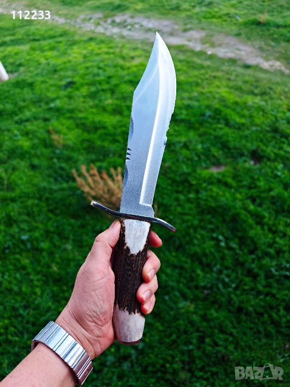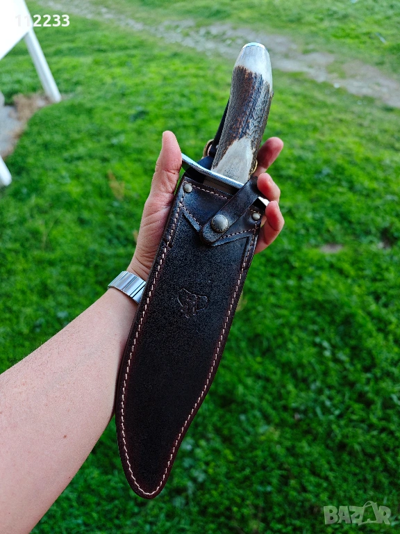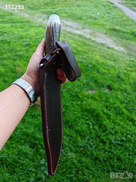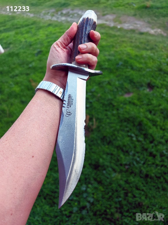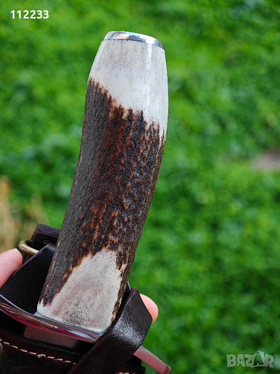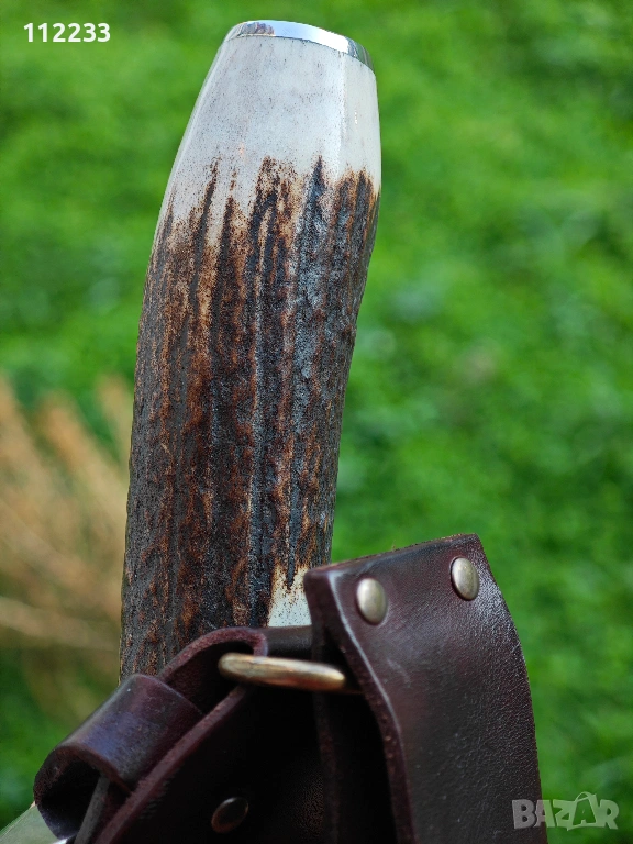 Дължина на острието 23,5 см!! цялостна дължина 33,5 см. Molibdenum steel 54/56 HRC, дръжка полиран еленов рог. Предлага се с дебела кожена кания