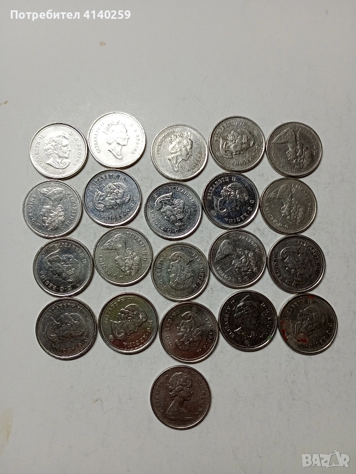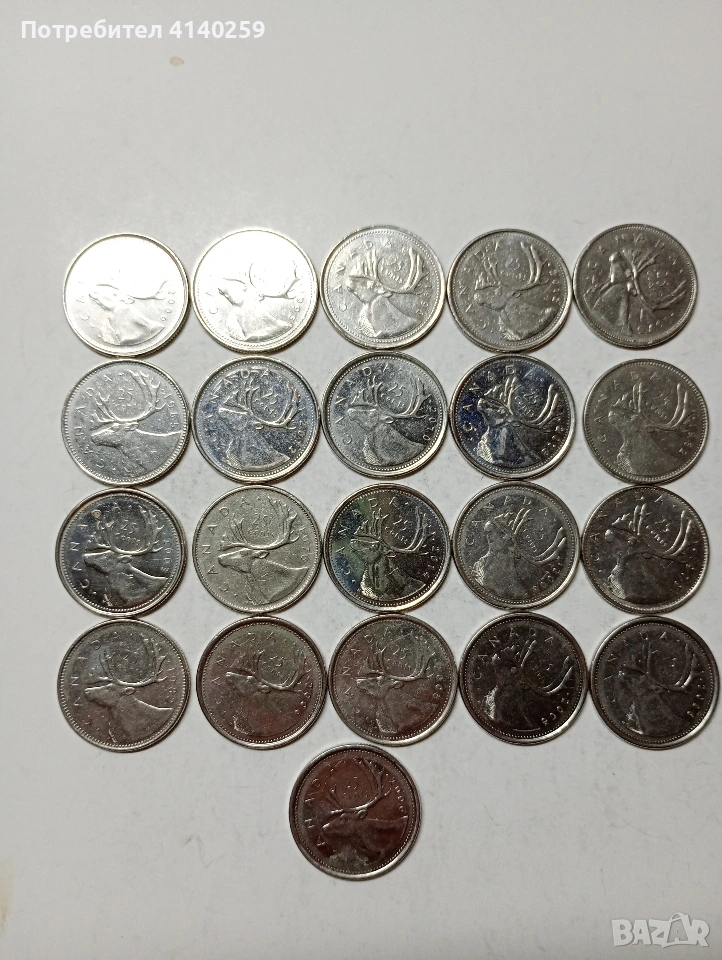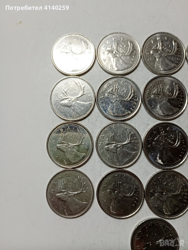 КАНАДА МОНЕТИ 25 ЦЕНТА 21 БРОЯ РАЗЛИЧНИ ГОДИНИ ИМА ПОВТАРЯЩИ НЕЧИСТЕНИ ЦЕНА ЗА 21 БРОЯ СЪСТОЯНИЕ ОТЛИЧНО ПОЛУЧАВАТЕ СНИМАНИТЕ МОНЕТИ РАЗГЛЕДАЙТЕ ДРУГИТЕ МИ ОБЯВИ ДА КОМБИНИРАТЕ ДОСТАВКА ЕКОНТ ЗА ВАРНА ЛИЧНО
