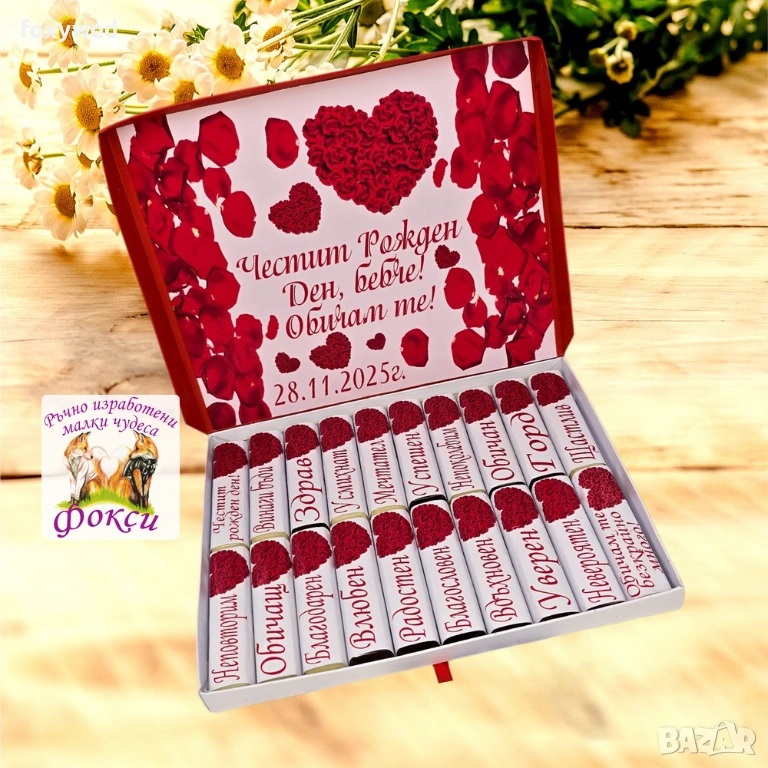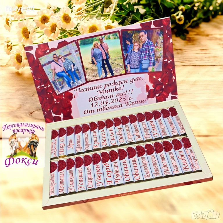 20 или 32 броя индивидуално опаковани шоколадови бонбони, с изписано име и дата на празник.