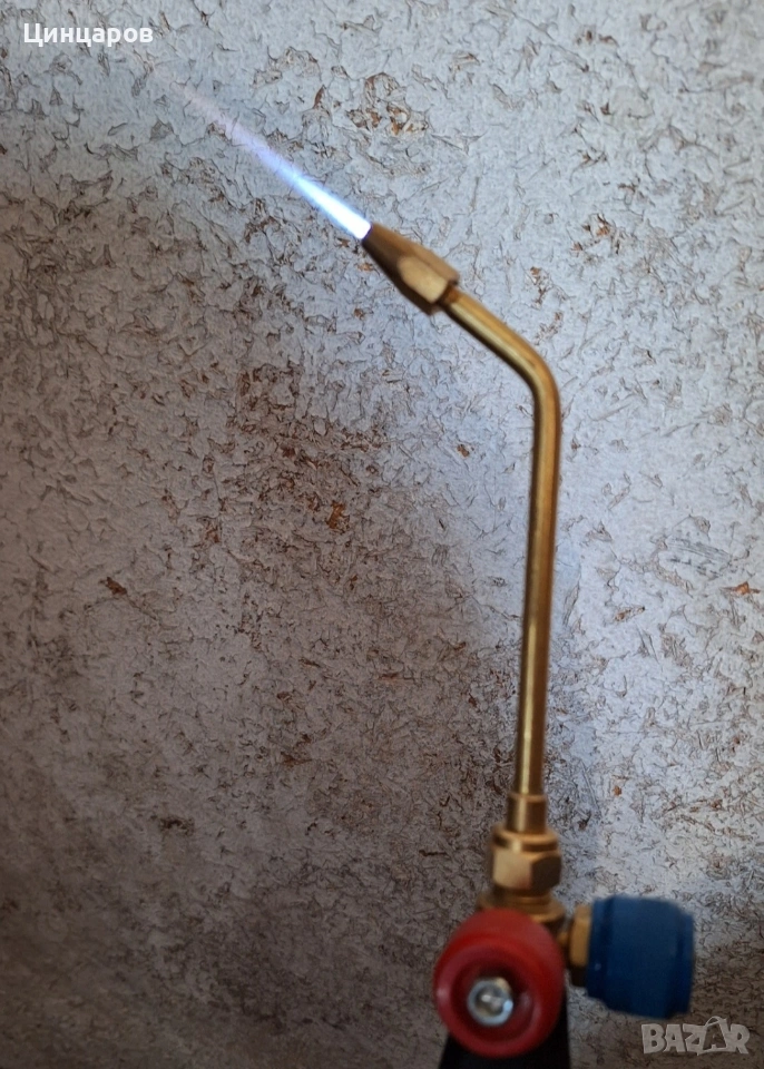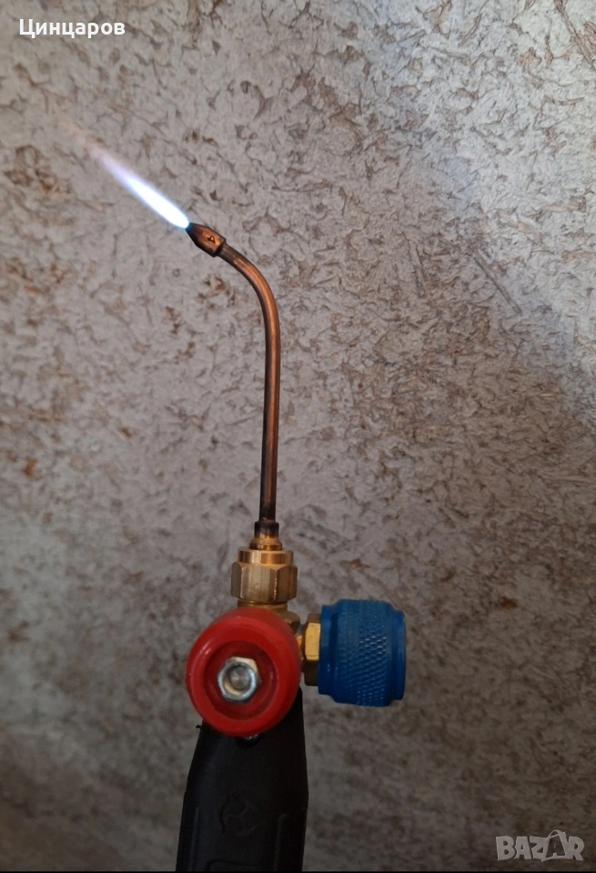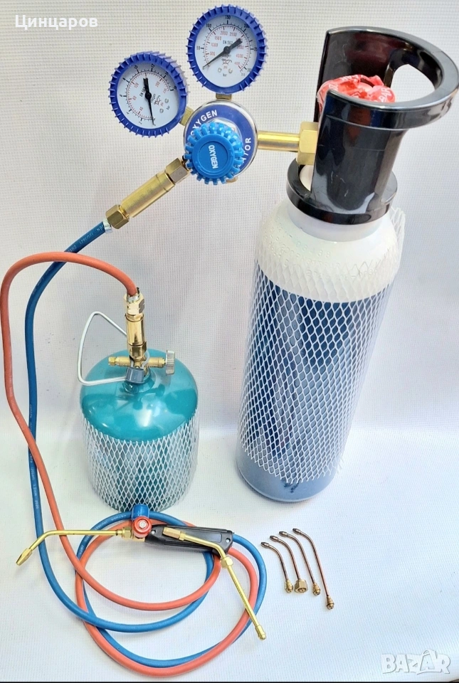 Горелка фино спояване, подгряване. Бутилки O2 и газ, редуцир, клапани предпазни