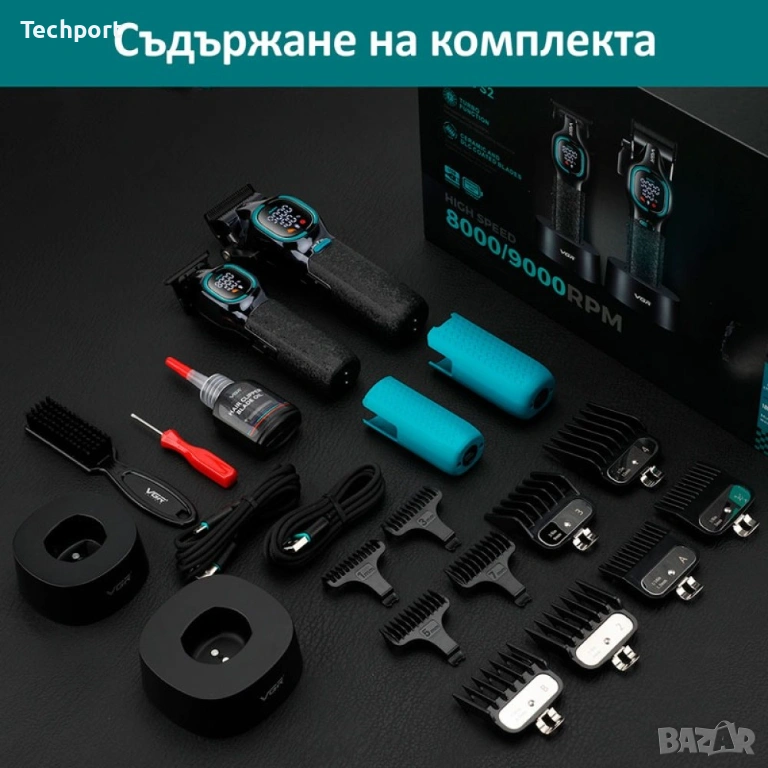 Професионален безжичен комплект VGR V-886 S2, включващ машинка за подстригване (clipper) и тример (patillera), създаден за висока производителност, прецизност и комфорт при работа. Моделът се отличава с мощен турбо режим до 9000 оборота в минута и ергономичен дизайн с допълнителни грипове за по-сигурен захват.