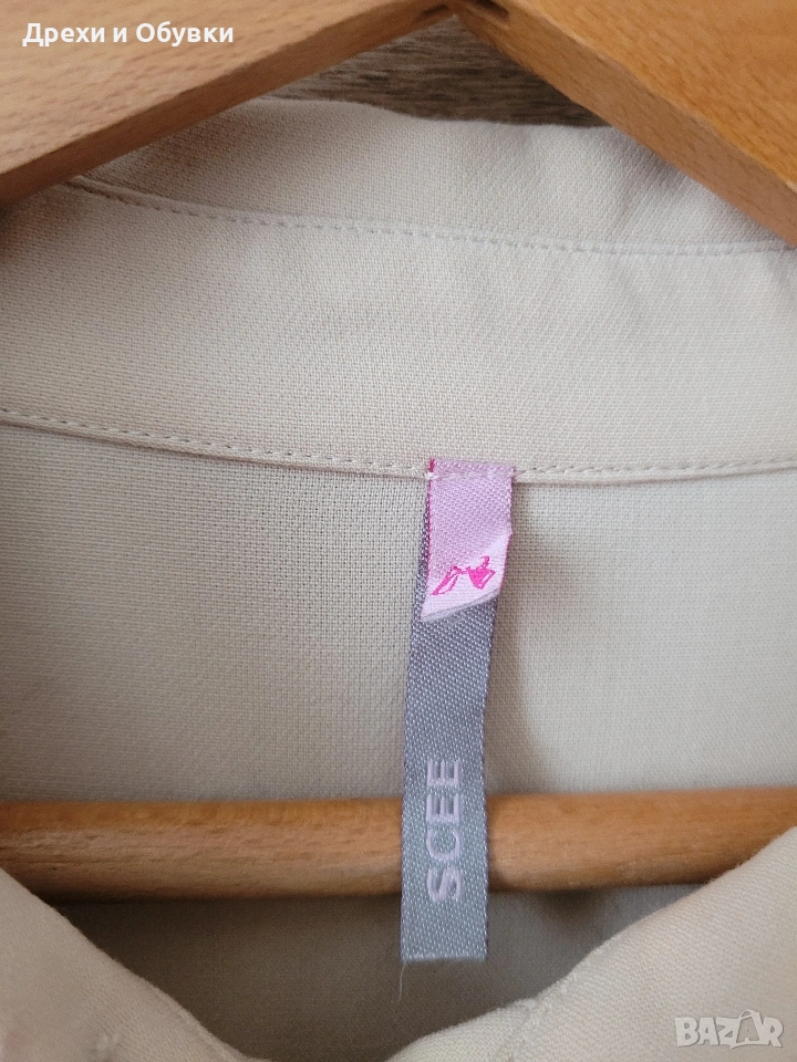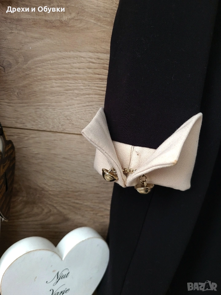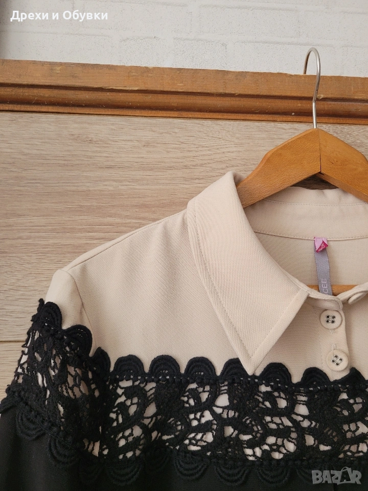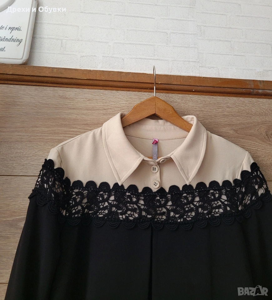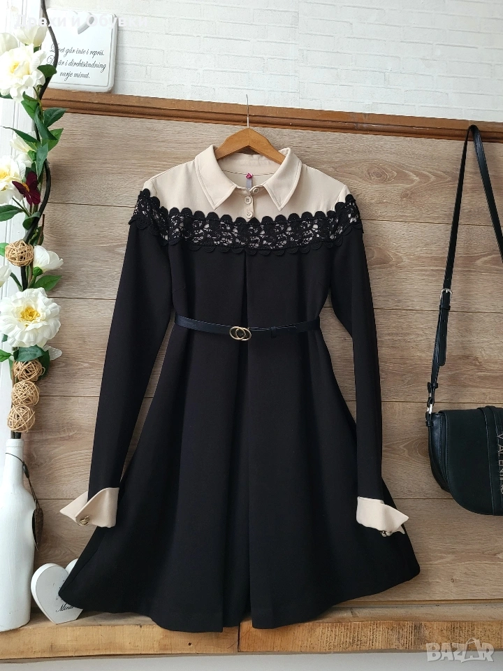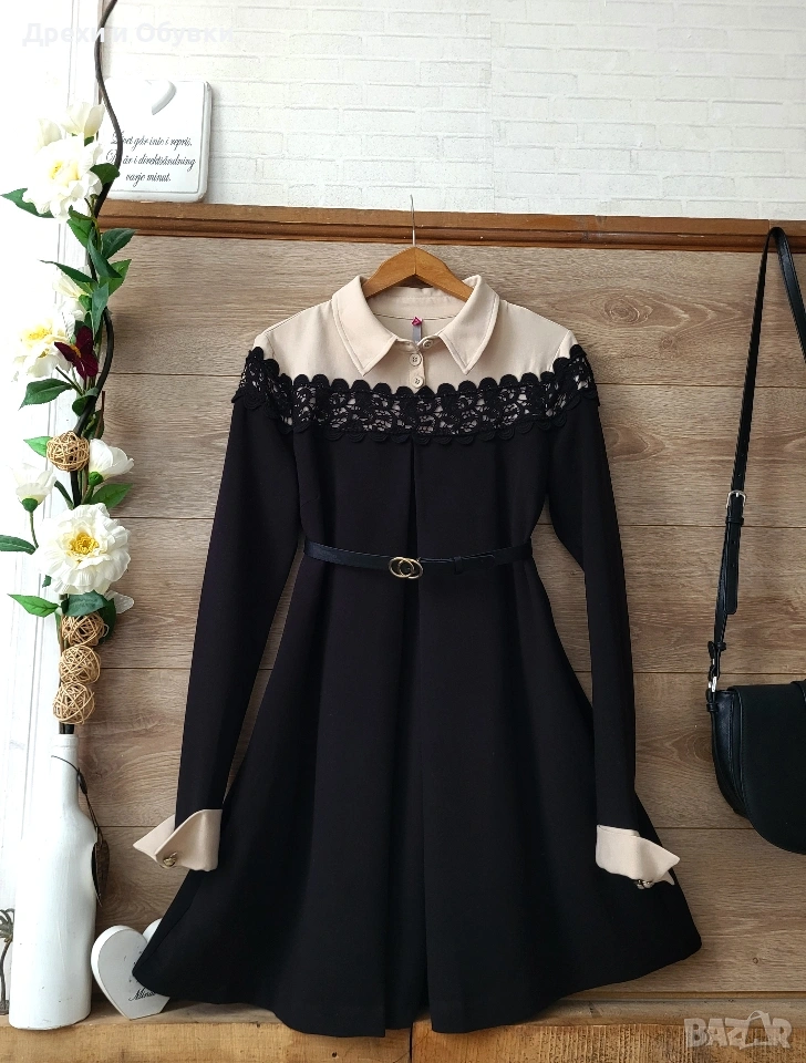 Изискана рокля в характерния за SCEE бутик стил, съчетаваща класическа елегантност и модерна женственост. Моделът впечатлява с фина дантела в горната част, контрастна светла яка и маншети, които придават аристократично излъчване и изтънчен завършек. Леко разкроената А-линия оформя красив силует. Ръкавите са акцентирани с нежни копчелъци свързани с метална златиста верижа, които добавят фин луксозен детайл и завършват визията с бутиково излъчване. Два странични джоба. Красив златист метален акцент панделка на гърба! Подходяща както за специални поводи, празници и вечерни събития, така и за стилна ежедневна елегантност. • Качествена материя с красива структура и плътност! Размер: М Отлично състояние, като нова. Модела е без коланчето ( може да се носи свободно или с коланче по избор). Цена 40€ Още снимки в коментар.