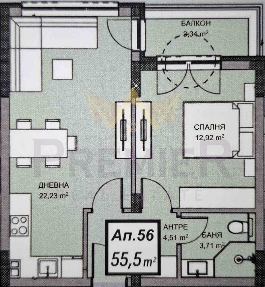Дневна с кухненска част 22.23 кв.м