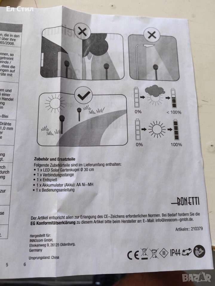 Захранване: вграден соларен панел + акумулатор AA Ni-MH (включен);
