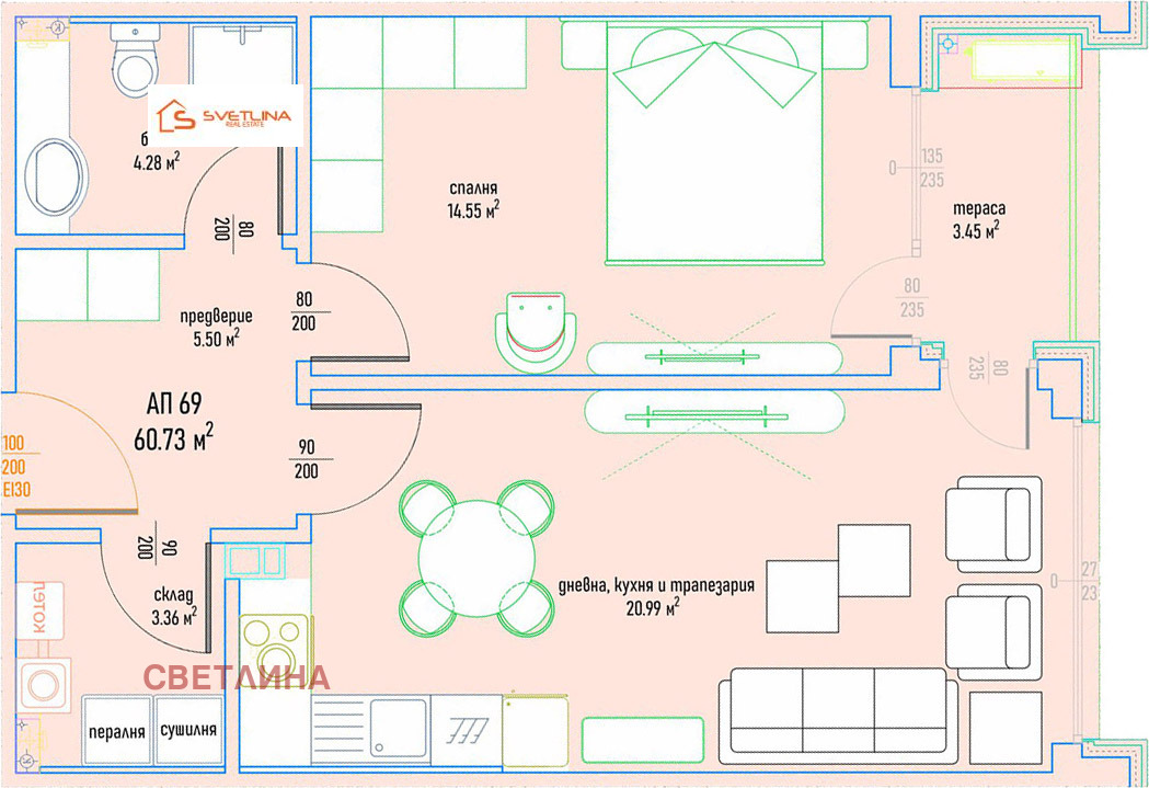- Разпдеделение: входно антре, дневна с кухненски бокс, спалня, баня с тоалетна, мокро помещение и тераса