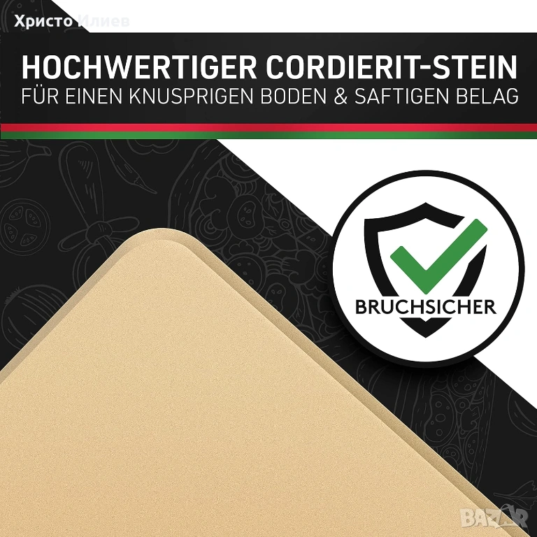 Почистване: След употреба оставете камъка за пица да се охлади и след това го почистете внимателно с влажна кърпа. Не използвайте агресивни препарати или абразиви.