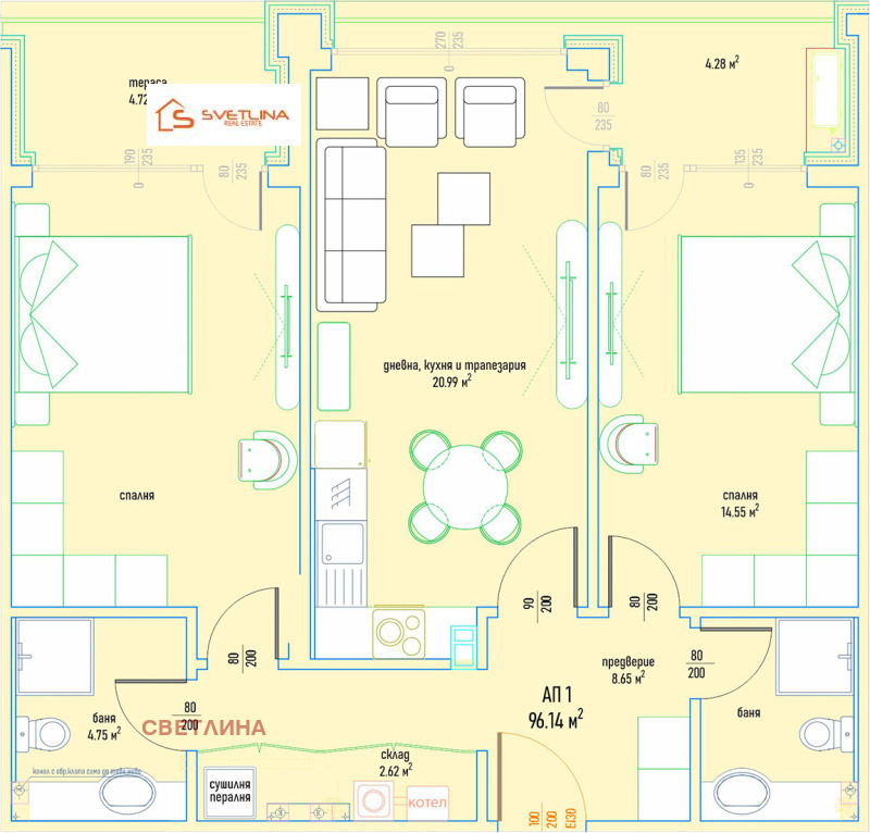 Жилището посочено в офертата е ситуирано на първи етаж със застроена площ от 96 кв.м. общи части 23 кв.м.