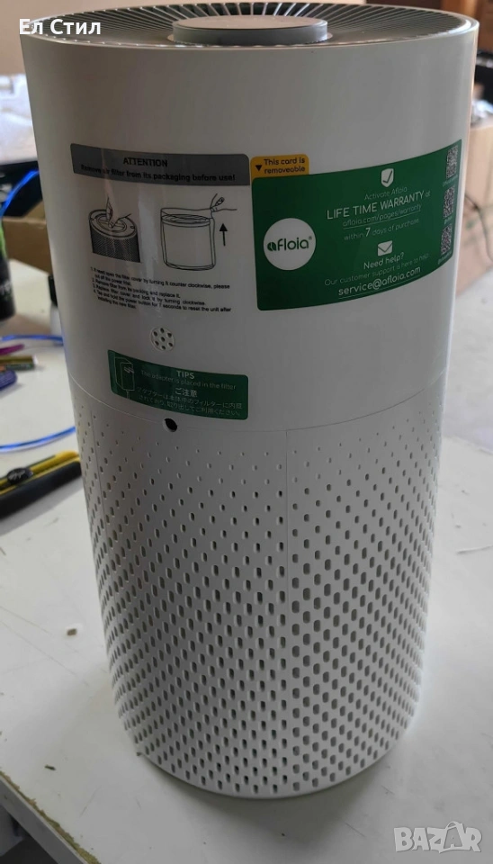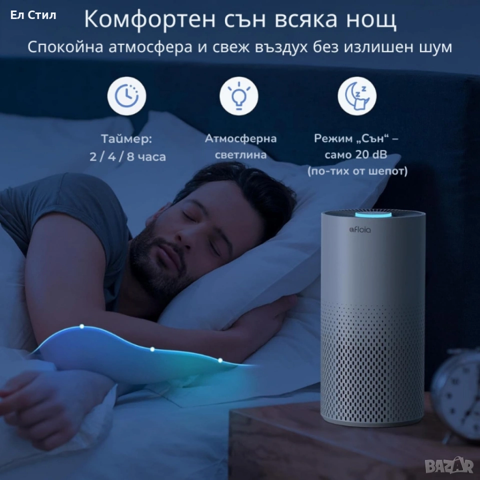 Модел: Afloia Kilo Пречиствателна система: 3-степенна (HEPA H13 филтър + активен въглен + предварителен филтър) Покритие: до 1076 ft² (100 м²) Капацитет на пречистване: 4 пъти на час за помещение от 25 м² Ниво на шум: от 22 dB (в Sleep режим) Таймер: 2/4/8 часа Осветление: 7 LED цвята, автоматично затъмняване в Sleep режим Управление: тъч контрол Смяна на филтъра: на 4–6 месеца (според качеството на въздуха) Опции за филтри: стандартен, антибактериален, за домашни любимци