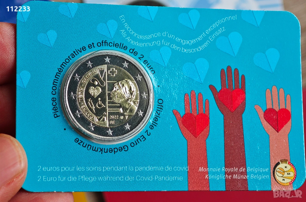 Тази белгийска монета от 2 € от 2022 г. в карта BU е посветена на медицинските работници, които в продължение на две години се бориха с пандемията COVID-19