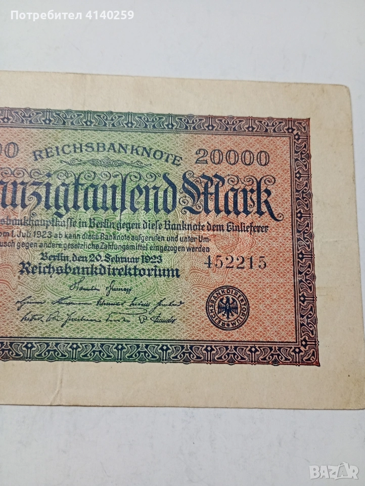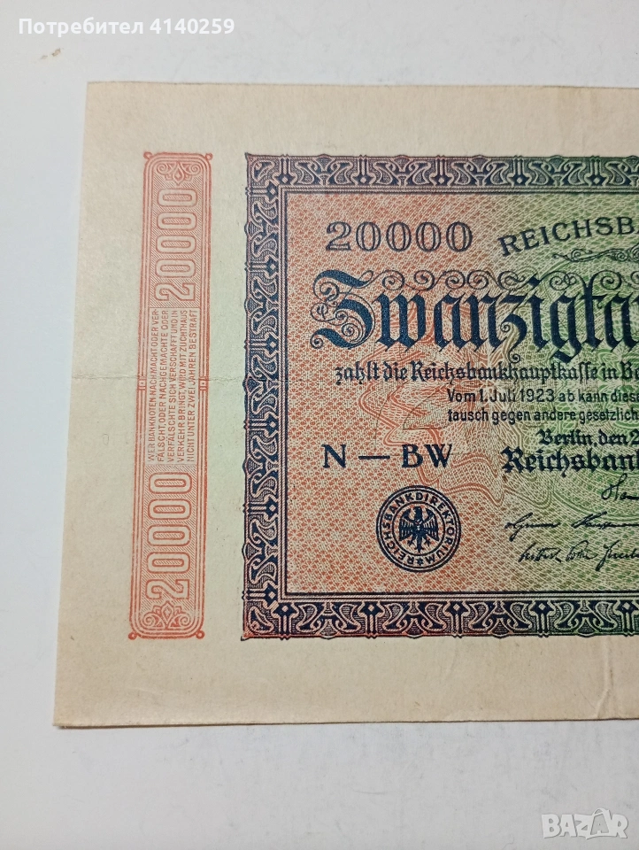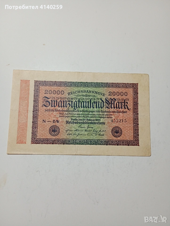 РАЙХ БАНКНОТА ГЕРМАНИЯ 20,000 МАРКИ 1923 Г СЪСТОЯНИЕ ОТЛИЧНО ПОЛУЧАВАТЕ СНИМАНАТА БАНКНОТА РАЗГЛЕДАЙТЕ ДРУГИТЕ МИ ОБЯВИ ДА КОМБИНИРАТЕ ДОСТАВКА ЕКОНТ ЗА ВАРНА ЛИЧНО