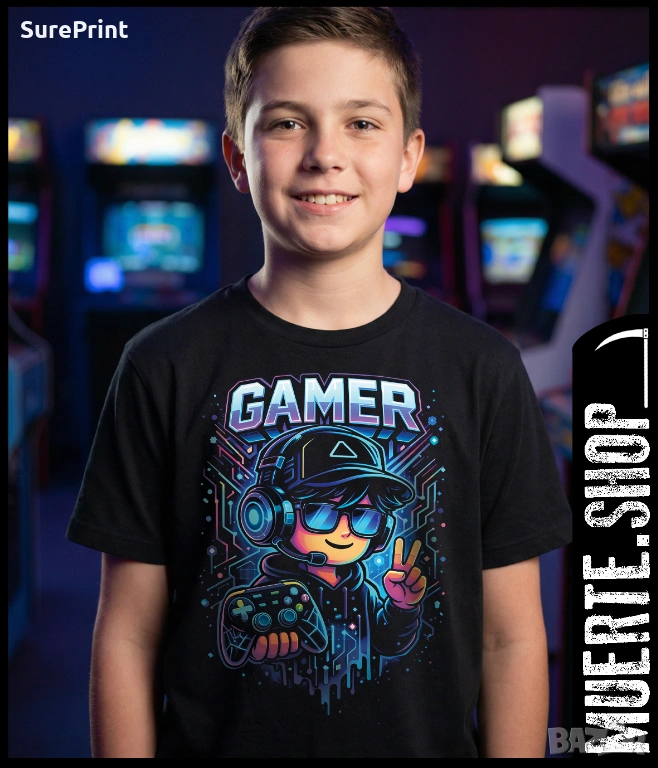 Модерна детска тениска за малък геймър. Подходяща за деца, които обичат видеоигрите и искат да покажат своя стил.