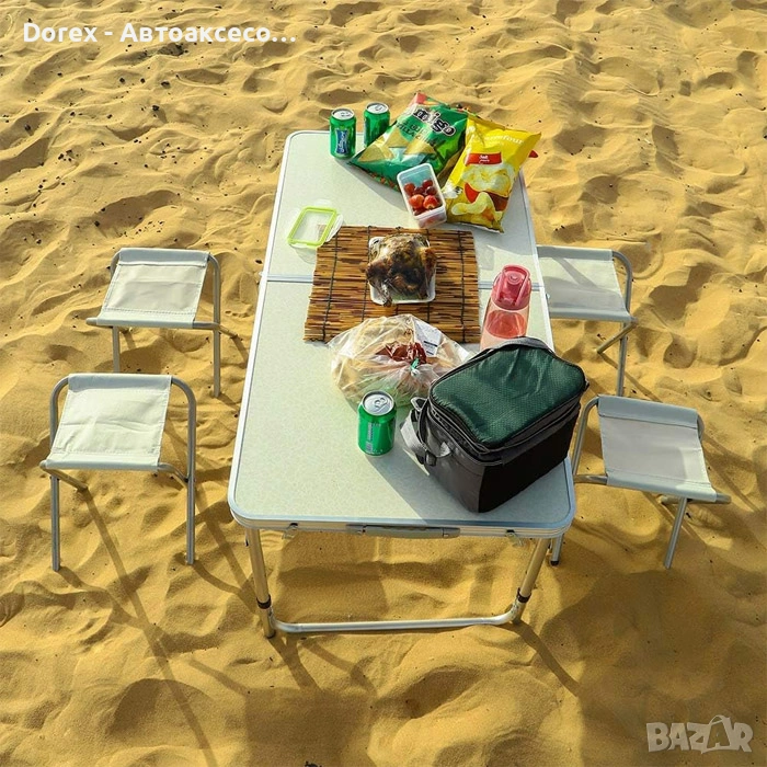 Практичен комплект от сгъваема маса и четири сгъваеми стола, създаден за комфортно хранене на открито. Перфектен избор за пикник, къмпинг, риболов, плаж или пътуване.