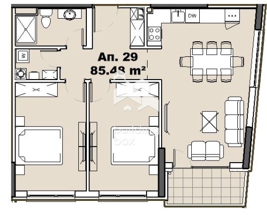 Имотът е с много добро разпределение, със застроена площ от 85.48 кв.м. Състои се от дневна с кухненски бокс, 2 спални, баня с тоалетна, тераса, склад и коридор. Изложението на апартамента е юг-изток. Сградата ще се отоплява на газ и климатици.
