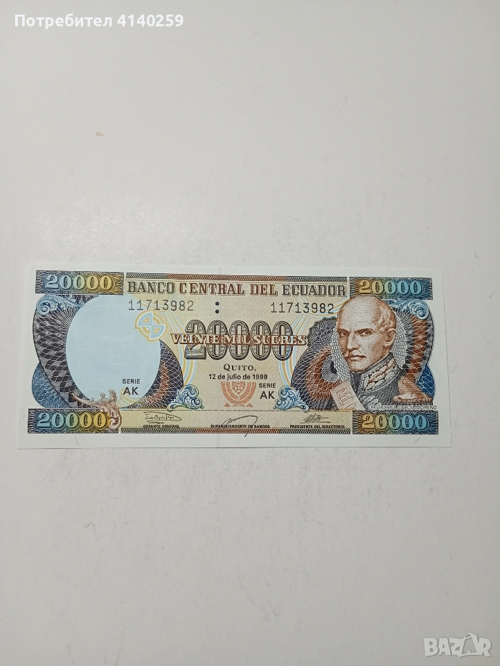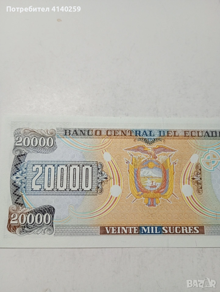 ЕКВАДОР БАНКНОТА 20,000 СУКРЕ 1999 Г СЪСТОЯНИЕ НОВО ПОЛУЧАВАТЕ СНИМАНАТА БАНКНОТА РАЗГЛЕДАЙТЕ ДРУГИТЕ МИ ОБЯВИ ДА КОМБИНИРАТЕ ДОСТАВКА ЕКОНТ ЗА ВАРНА ЛИЧНО