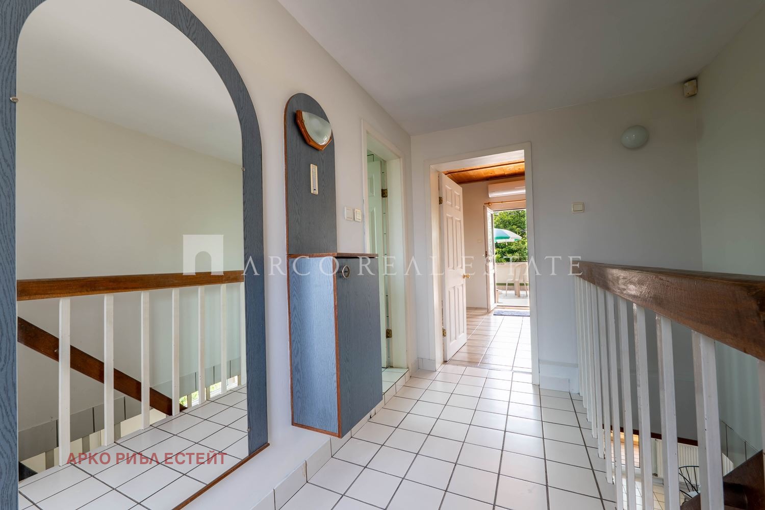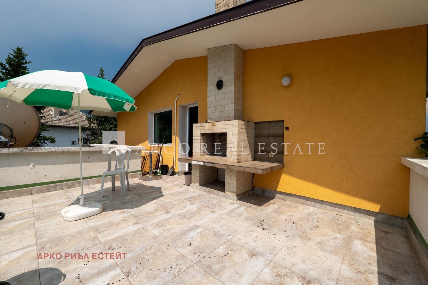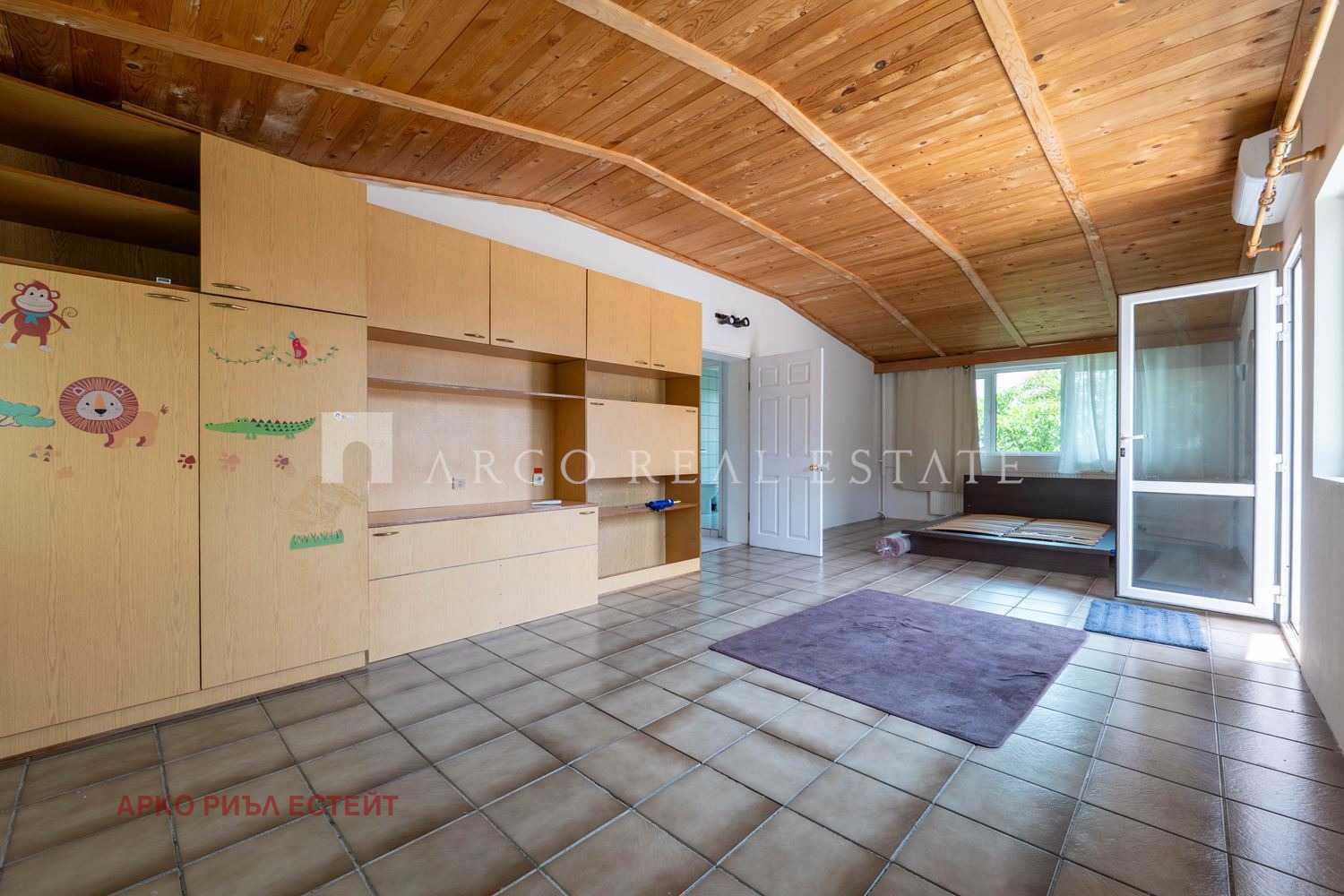 Само на 60 метра навътре по частен път, обгърната от тишина, високи борове и зеленина, Ви очаква просторна четириетажна къща с усещане за планинска вила и комфортна градска резиденция.