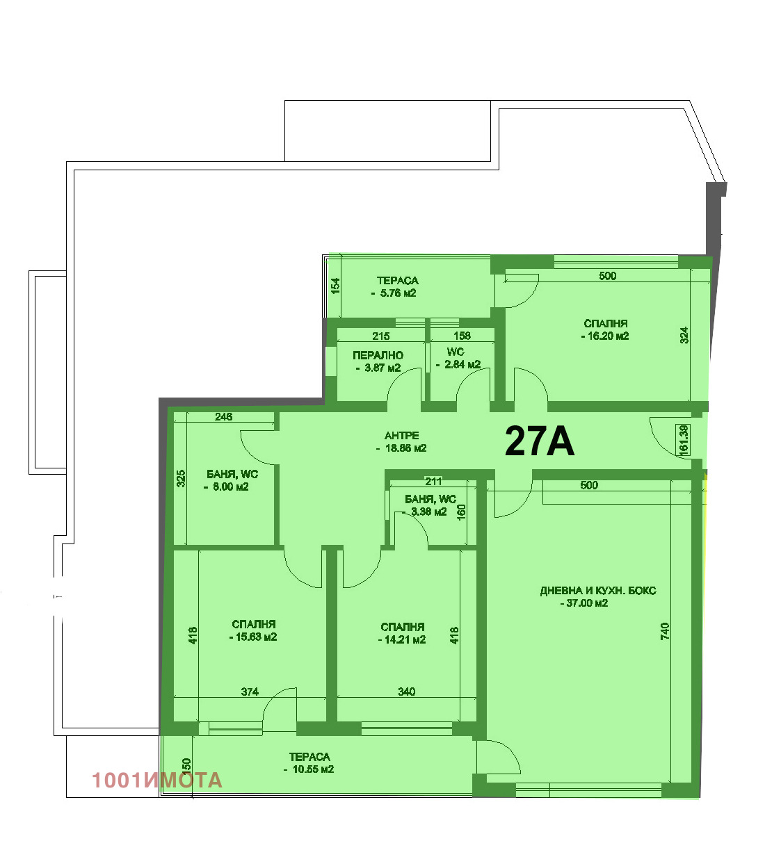 южна тераса към дневната и другите две спални 10.55 м2