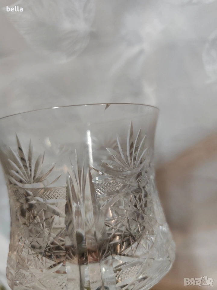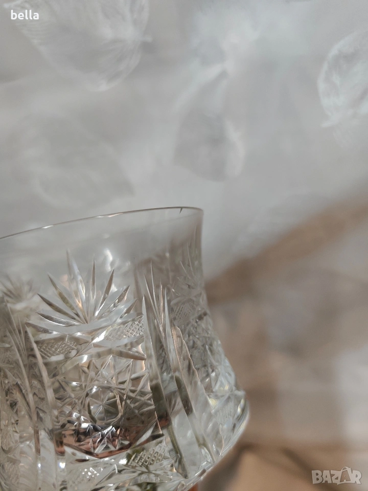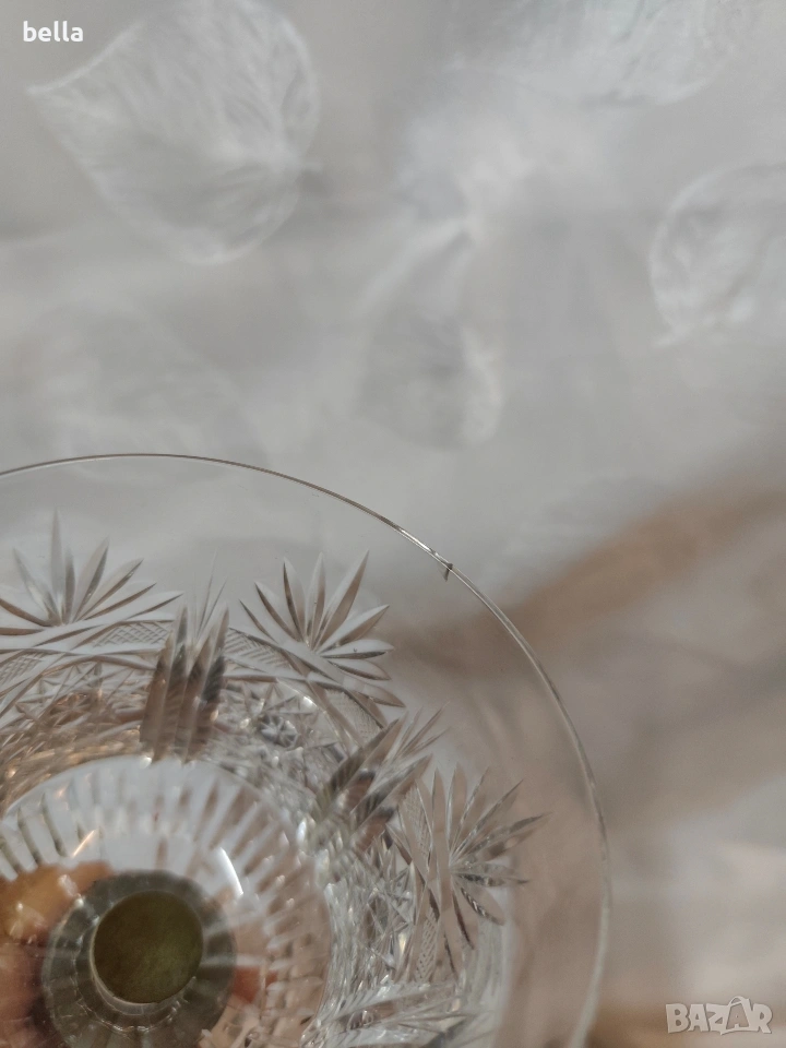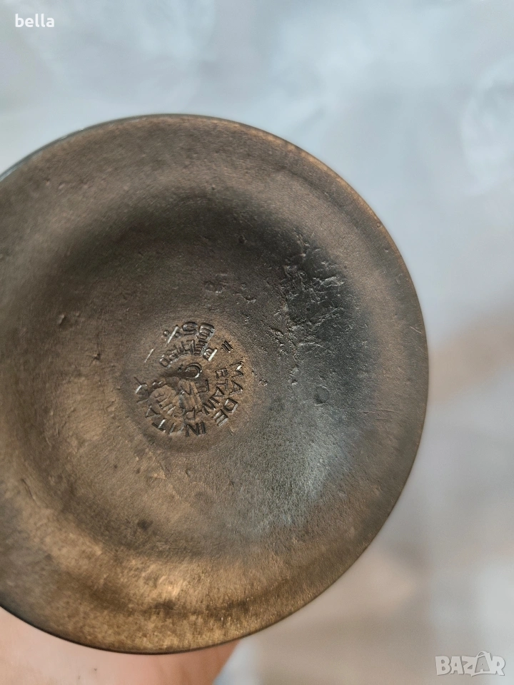 Чашата е изработена е от висококачествен калай (Pewter). На дъното ясно се вижда печатът "95% Peltro". Това означава, че сплавта съдържа 95% чист калай, което е стандарт за луксозните предмети от този тип, тъй като е безопасен за хранителни цели (не съдържа олово). Горна част: Самата чаша е от кристал с богата диамантена шлифовка. Комбинацията от метална основа и кристална чаша е типична за италиански марки като Brescia Peltro или Arte Italica. Предметът е в стил Винтидж / Ретро и вероятно датира от периода 1970-1980 г.. Дизайнът е класически, често използван за дегустация на вино или като декоративен бокал за тържествени случаи.Има една лека драскотина в горния край но е дребна аз съм увеличила снимката за да се види като се пипа от двете страни кристала е гладък няма липса явно само е пукнато леко .Цена 45 евро