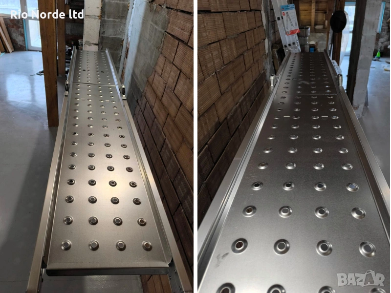 Платформата е изработена от поцинкована ламарина с дебелина 1 мм. Повърхността е перфорирана и релефна, което осигурява противохлъзгащ ефект и стабилност при движение. Размерите на двете части, подредени една върху друга в опаковката, са 115 × 32 см. Общото тегло е 5.4 кг. Моделът е съвместим с мултифункционални алуминиеви стълби тип 4х4, използвани в позиция скеле.