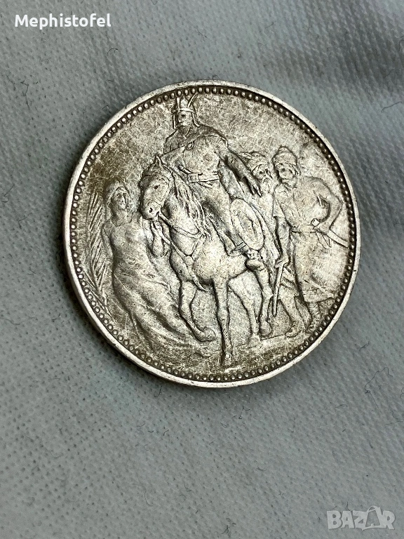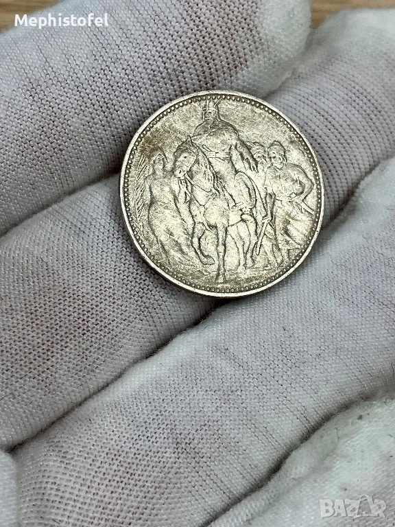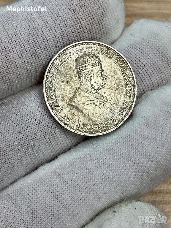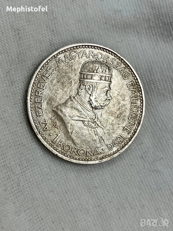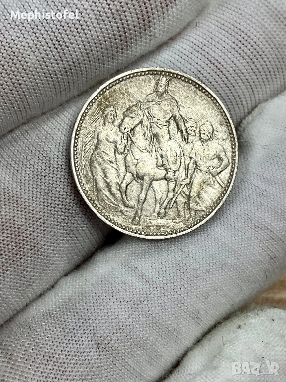 Автентична, стара сребърна монета от края на XIX век - 5 грама каталожно тегло, сребро проба 0.835, 23 мм диаметър, надписан гурт, рядка монета. От едната страна е изобразен император Франц Йосиф I с унгарската корона на Св. Стефан, от другата група унгарски воини/завоеватели.