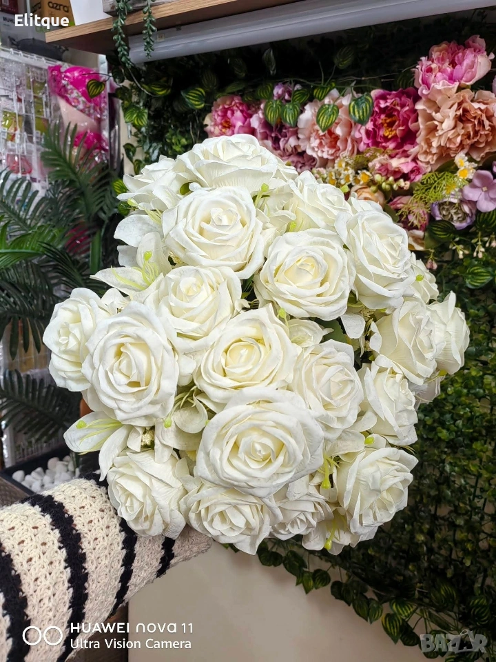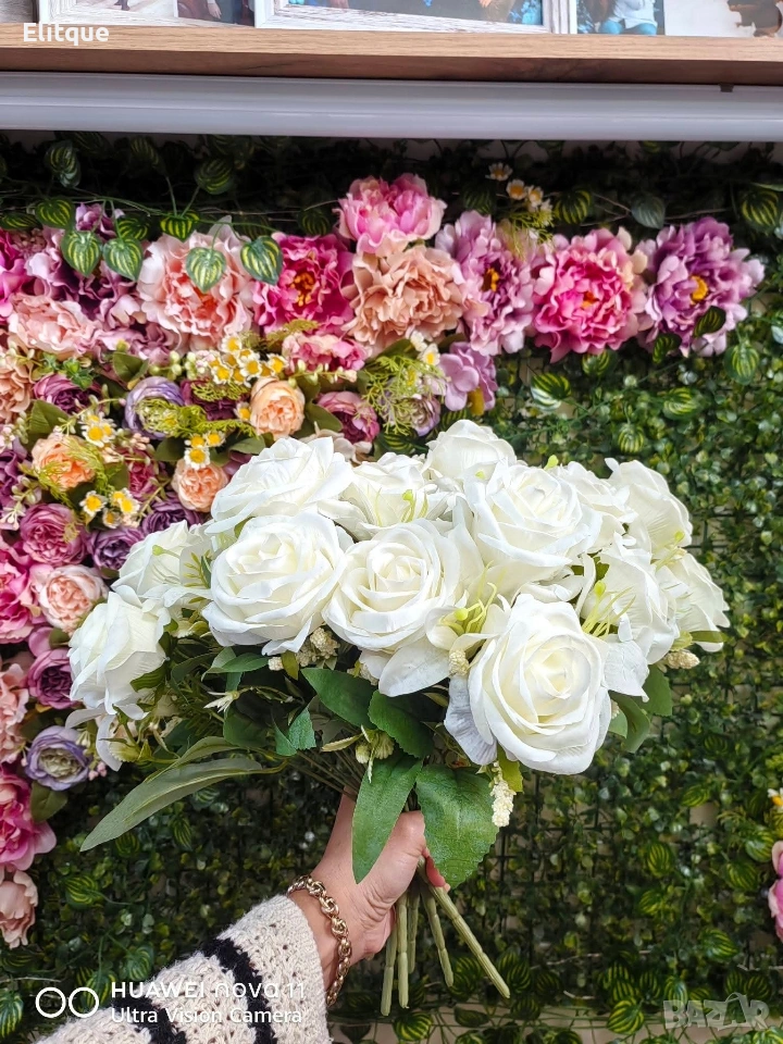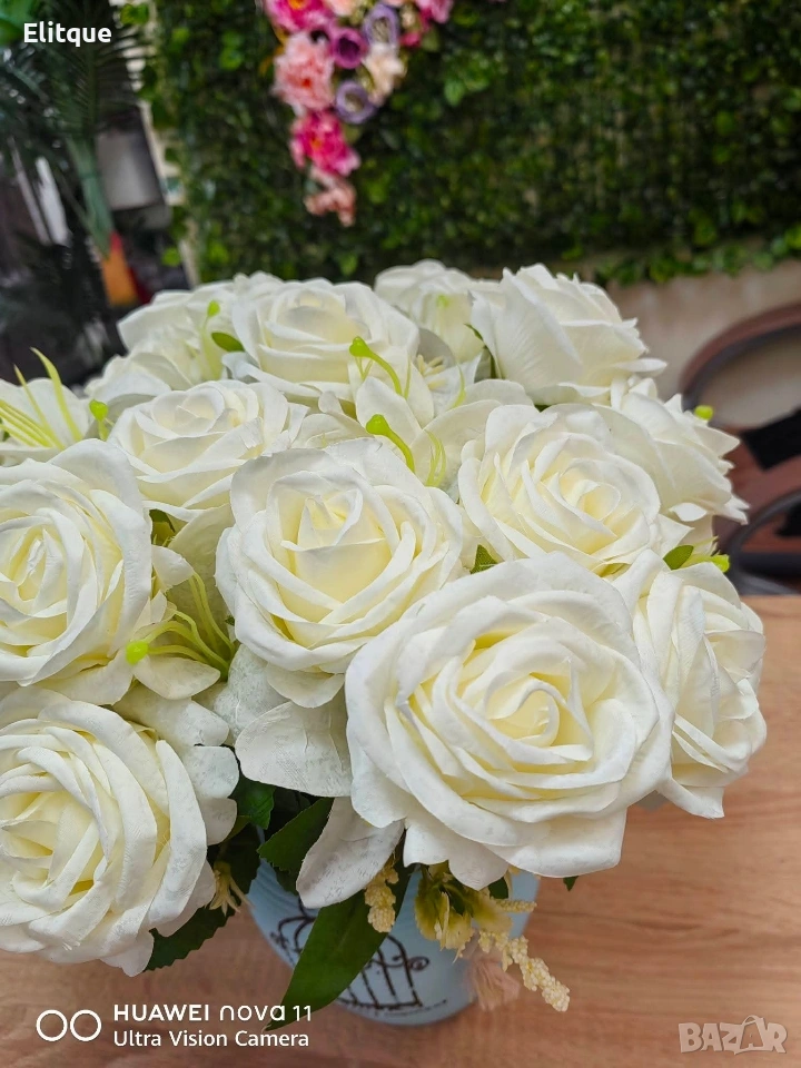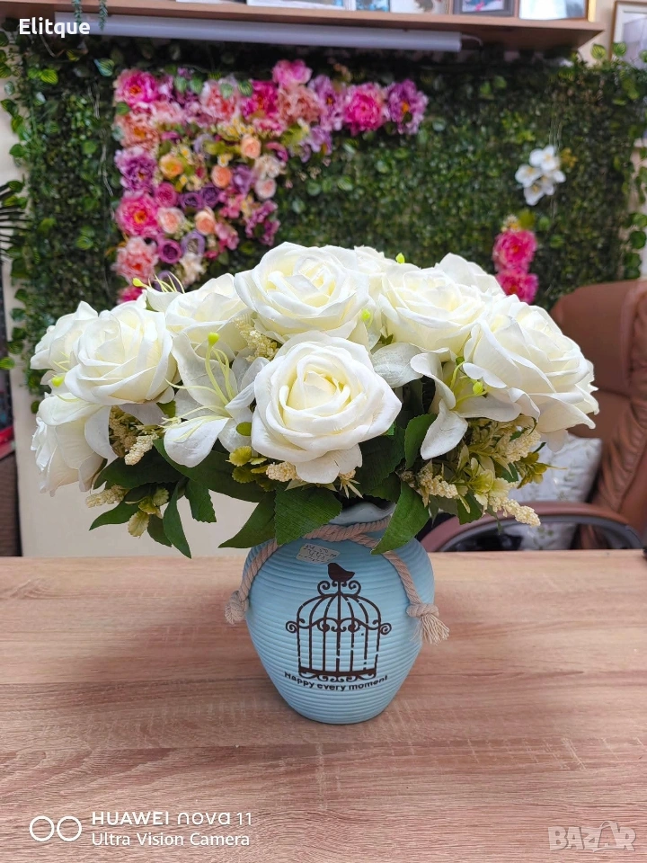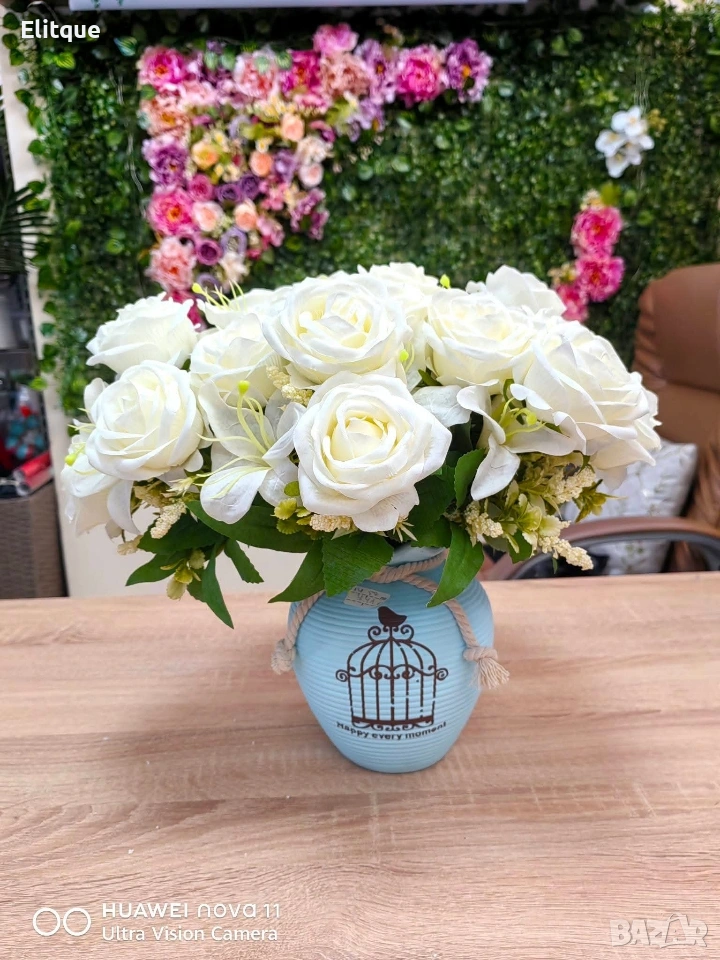 Тип продукт: Изкуствен букет с рози; Материали: Плат (текстил) и пластмаса; Композиция: Рози + малки бели цветчета + евкалиптови листа; Цветове на розите: Светлосин, Бледожълт, Червен, Розов, Бял; Ваза: Не е включена; Поддръжка: Почиства се с мека суха или леко влажна кърпа.