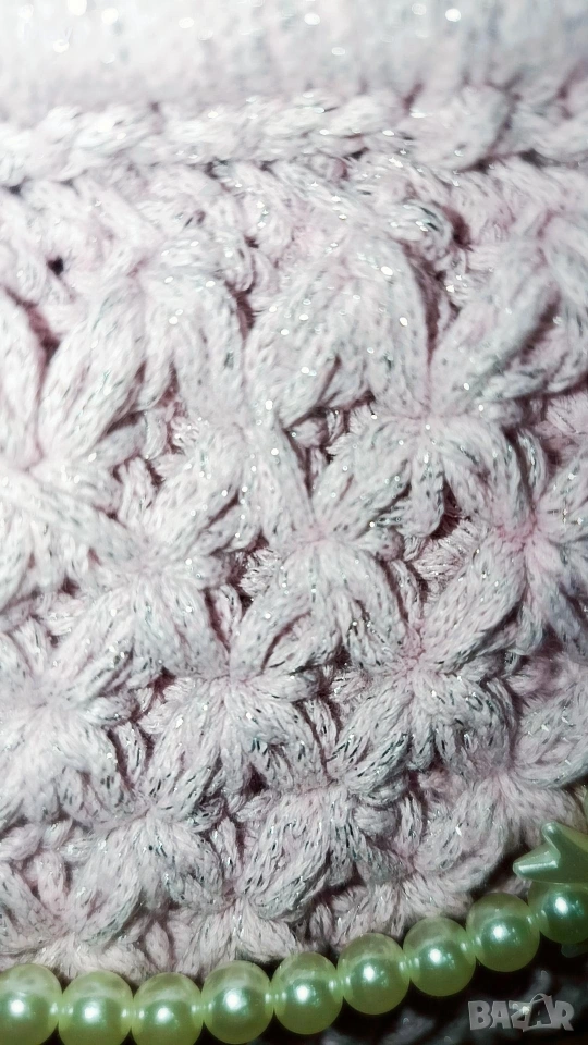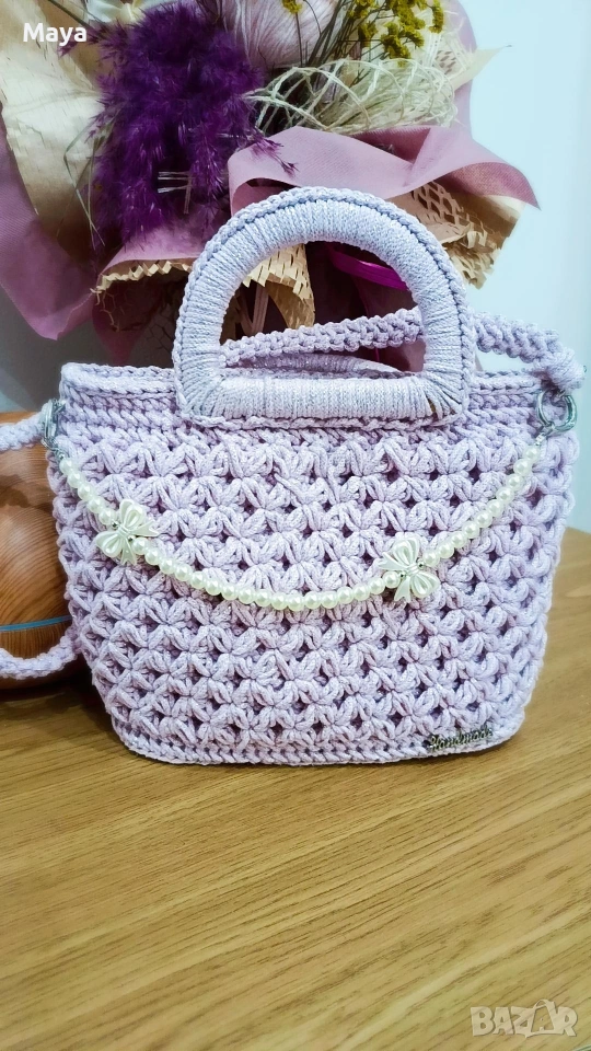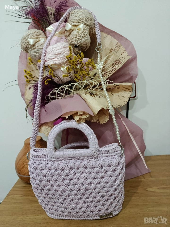 Ръчно плетена чанта в нежно млечно розово с деликатни блестящи нишки ✨ Изработена от памучна макраме прежда с красива релефна текстура и перлен акцент.