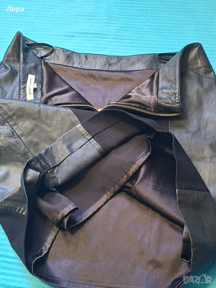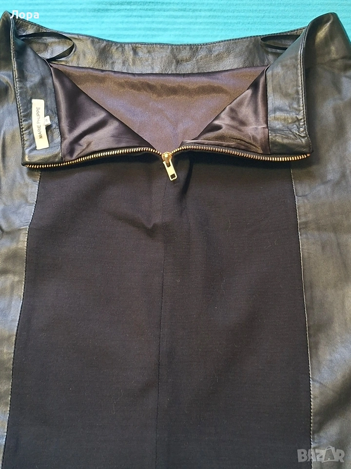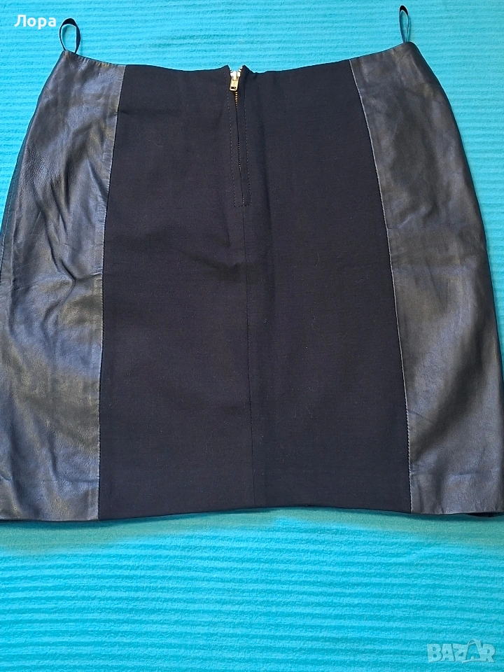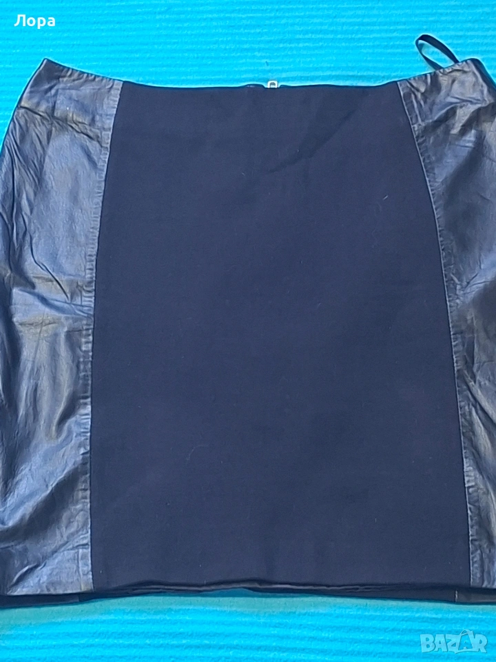 Дамска пола съчетание естествена кожа и плътно трико. Полата е с подплата. Размери ширина в талията едностранно 41 см. ханш 50 см. дължина 45 см. Блузата е подарък. Изпращам по Еконт с опция преглед и тест. Полата няма забележки.