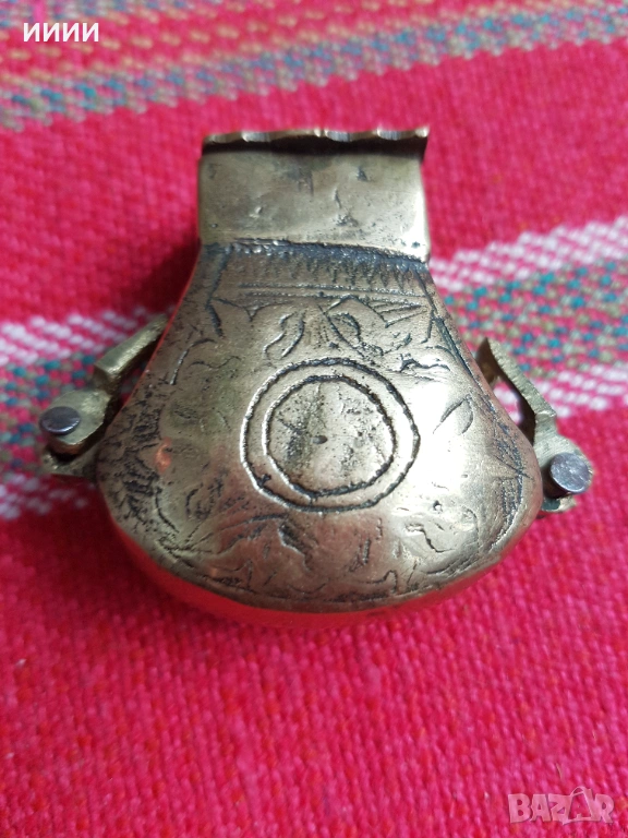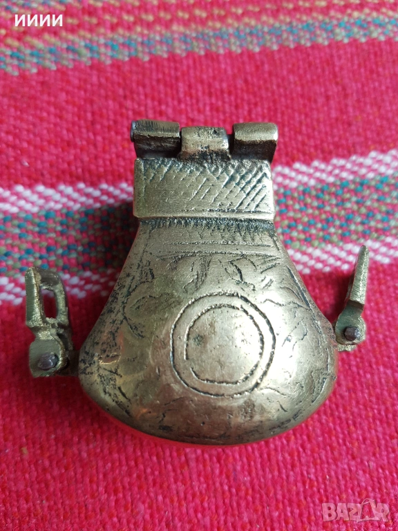 Над 200 годишен, ръчно изработен от дебелостенен бронз, без никакви забележки. Капакът му без усилие не се отваря. Размери 53 на 52 мм.