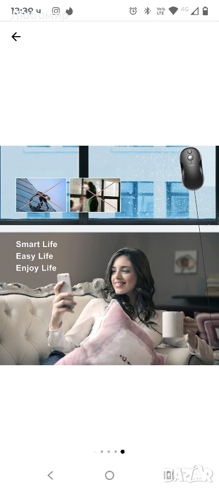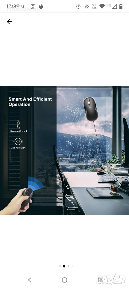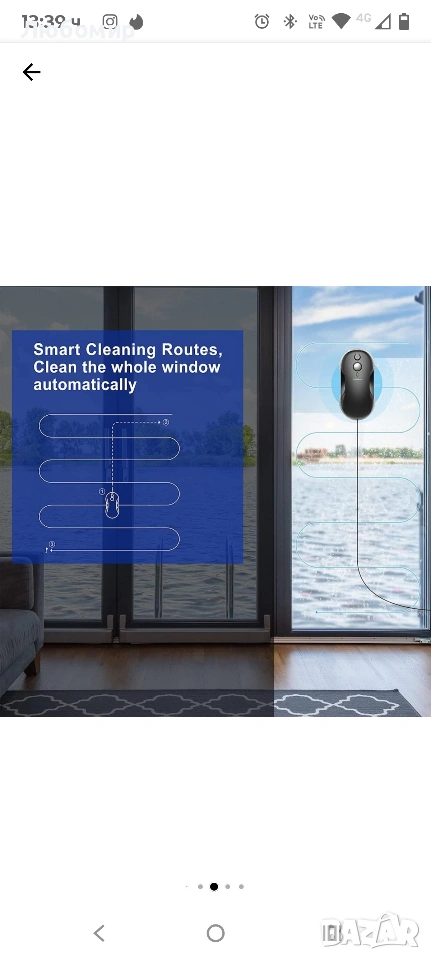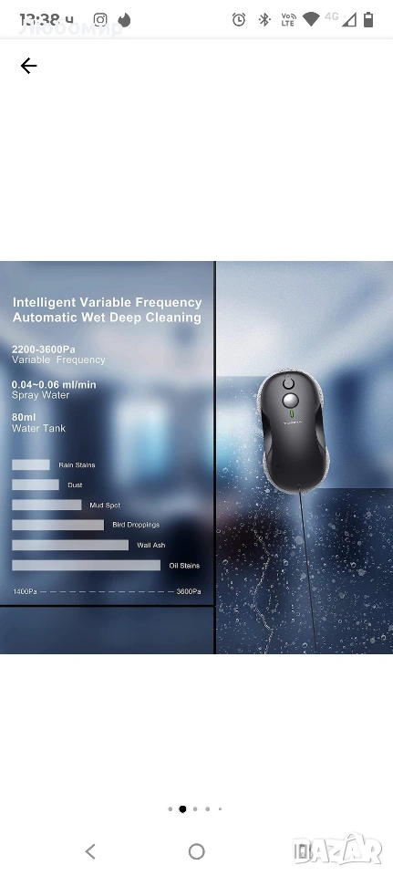 Ако все още има петна от вода, можете да използвате суха кърпа, за да избършете отново и това може ефективно да премахне петната от мъгла и вода. Препоръчва се и редовно почистване на прозорците.Със своята оптимизирана всмукателна мощност от 3800 Pa, роботът за прозорци винаги прилепва добре към прозореца и има следните основни предимства: автоматично разпознава степента на замърсяване и съответно регулира всмукателната мощност , за да почиства всички видове гладки повърхности като стъкло, огледала , големи плочки, мраморни плоскости, дървени врати и др. (да не се използва с: наклонени прозорци и вътрешността на покриви)