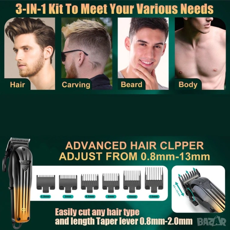 Включени компоненти: 10 гребена, четка за почистване, двойна фолио самобръсначка, машинка за подстригване, тример