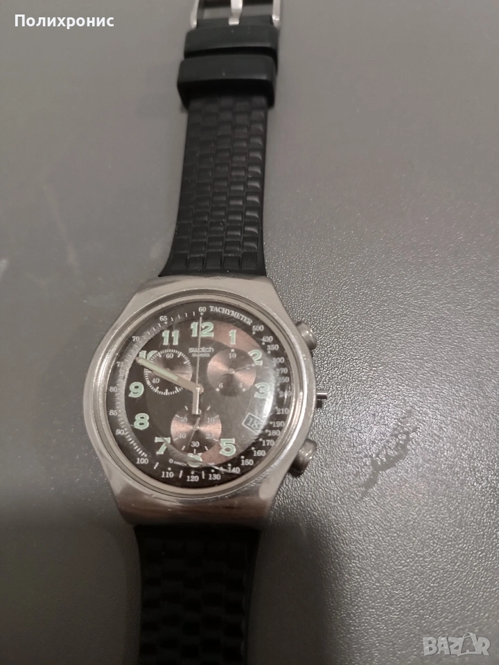 Работещ швейцарски хронограф Swatch Iron ,голям размер 45 милиметра без коронката ,оригинална силиконова каишка и катарама като нова.Чадовнока е без коронка и стъклото има пукнатина.Всичко се вижда на снимката.Всички функции на часовника работят .
