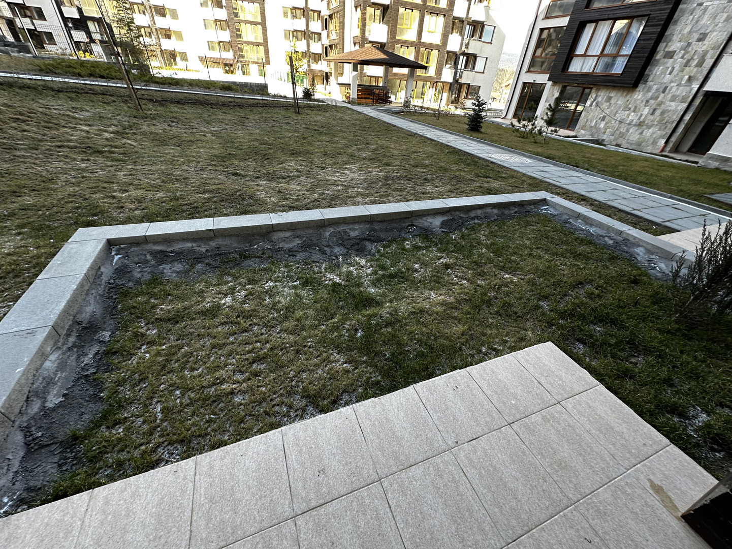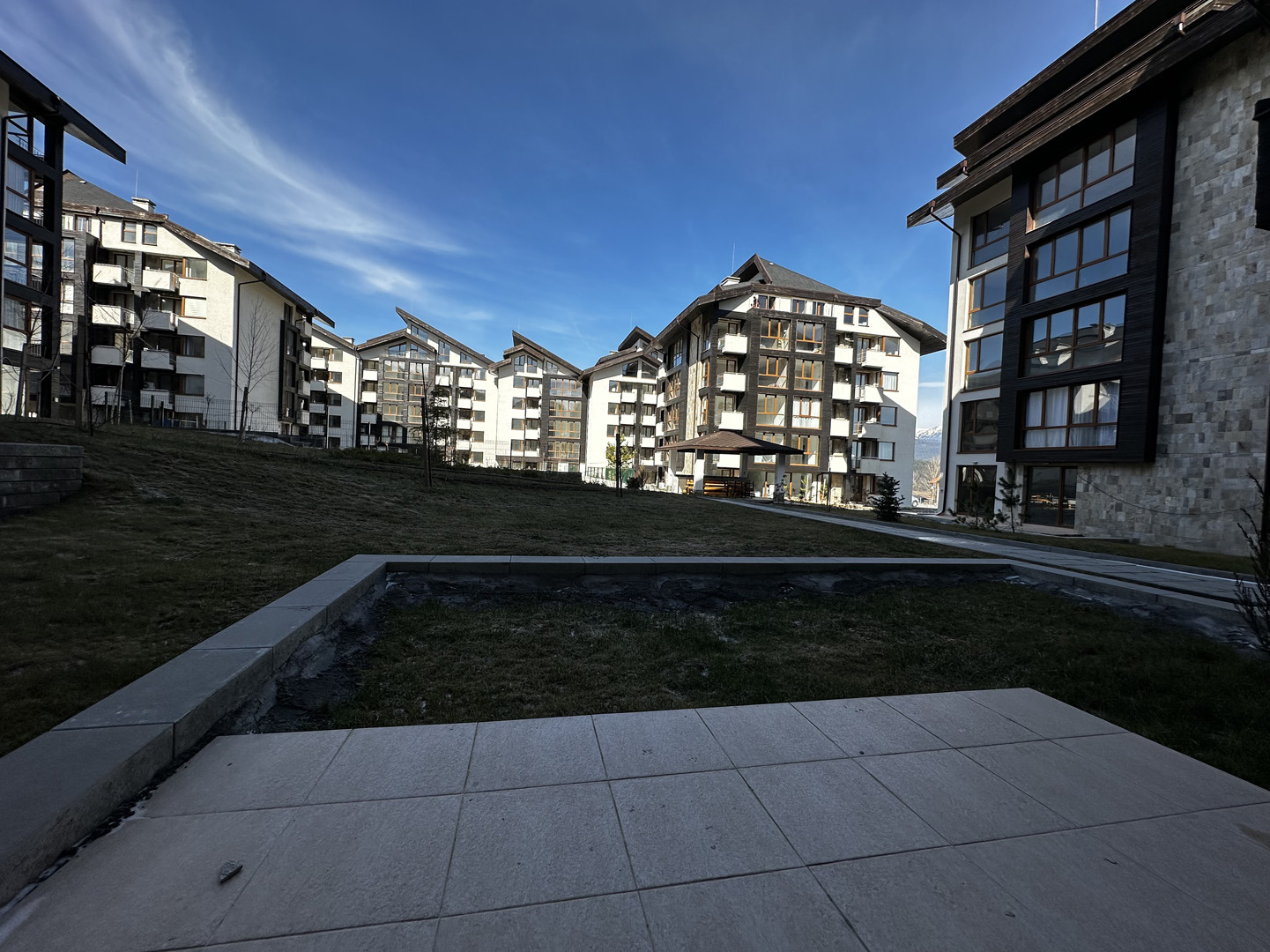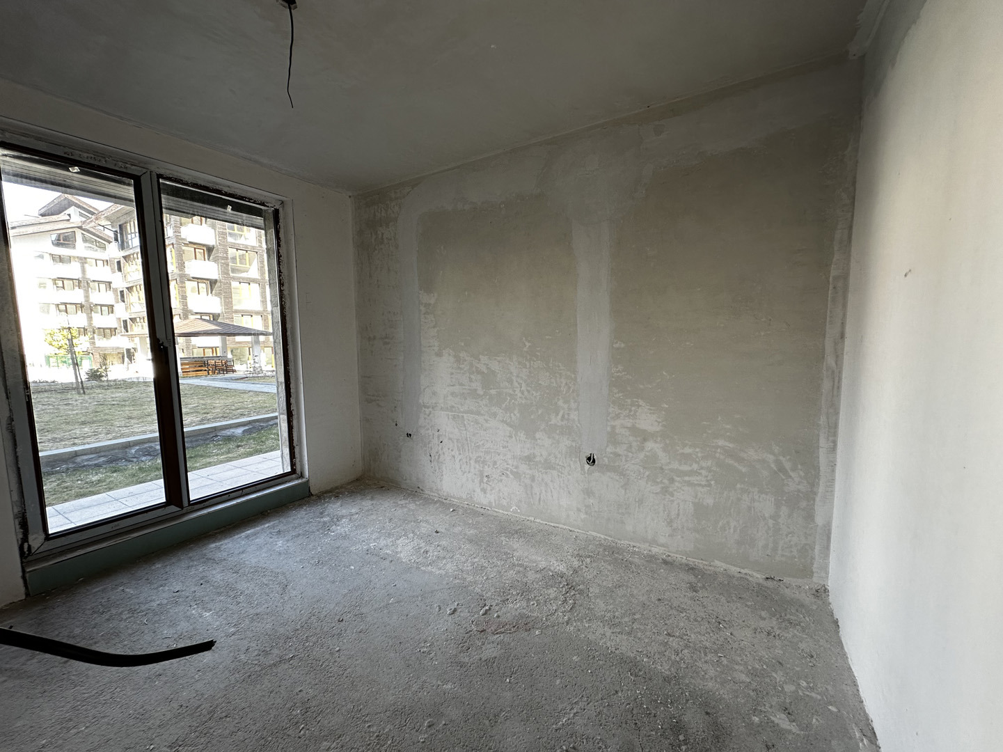 Апартамента се намира н партерен етаж и има западно изложение. В имота се влиза през антре, където е разположена банята. Там може да се постави гардероб и порт манто. От спалнята се излиза на голяма озеленена градинка, която принадлежи на апартамента. Пред него има озеленена площ и басейна. Имота се предлага на замазка.