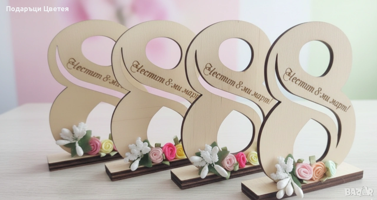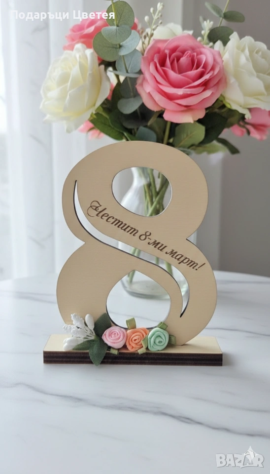 ​Изненадайте любима жена, майка, баба или колежка с този елегантен и стилен сувенир, изработен от естествено дърво. Тази декорация е перфектният начин да кажете „Благодаря“ и да оставите траен спомен от празника. ​Материал: Висококачествен дървен материал (шперплат), лазерно изрязан и гравиран с прецизност. ​Размери: Компактен и удобен размер 8 x 10.5 см, идеален за поставяне на бюро, етажерка или нощно шкафче. ​Стабилност: Разполага със здрава дървена основа, която позволява на сувенира да стои самостоятелно.