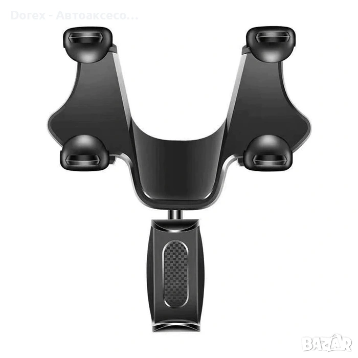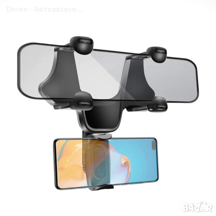 Практична универсална поставка за телефон, предназначена за монтаж към централното огледало за обратно виждане. Отлично решение за използване на навигация при дълги пътувания или за гледане на видео от пътниците.
