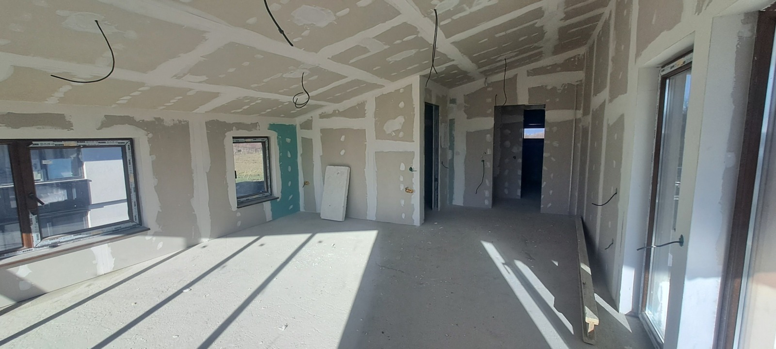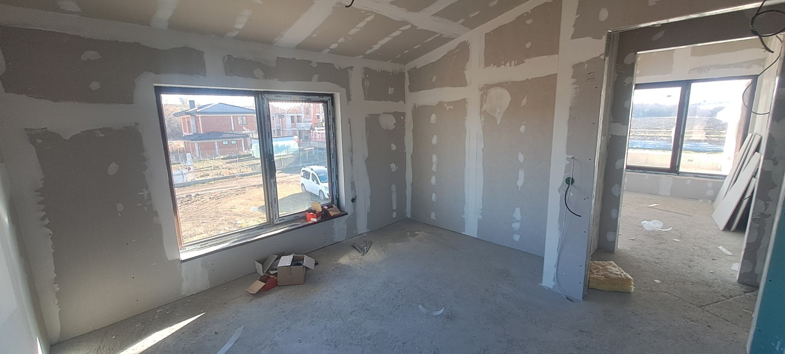 PL GROUP представя къща с АКТ 16, намираща се на границата между гр. Божурище и с.Гурмазово. Ниво 1 (кота 0) се състои от просторна дневна с кухненски кът, с голяма веранда пред нея, кабинет/спалня, баня с тоалетна, самостоятелна тоалетна, техническо помещение/склад и коридор. Ниво 2 разполага с общо три спални, като едната е със собствена баня и гардеробна, голяма тераса с правилна форма, баня с тоалетна за етажа и складово помещение. Построена по специална енергоефективна технология с термопанели конструкция, къщата е с изградени ВиК и Ел. инсталации, навсякъде е изградено подово отопление, инсталация за термопомпа. На втория етаж има специално окабеляване, в случай, че бъдещия собственик желае да постави соларни панели на покрива. Дограмата е Kömmerling - 5 камерна с двоен стъклопакет. Съвременно изградена с предвидени всички удобства в крак с технологиите. Равен двор с правилна форма, с изграден сондаж с всички надлежни документи. Къщата се захранва от чисто нов трафопост и електрическо трасе. Районът е тих и спокоен и се оформя като вилна зона с нови къщи. За повече информация и огледи - Румен Шаламанов 0882085005.