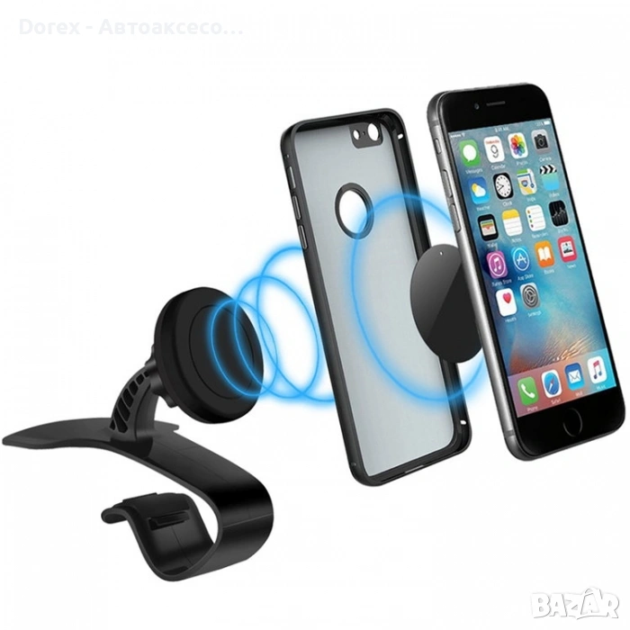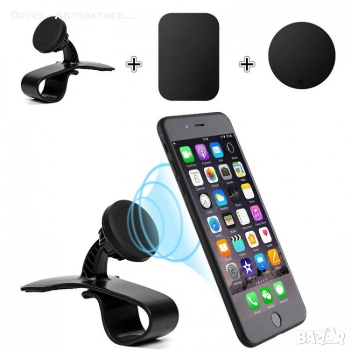 Практична универсална стойка за телефон със щипка и магнитно захващане, осигуряваща стабилно фиксиране и удобен достъп до устройството по време на шофиране.