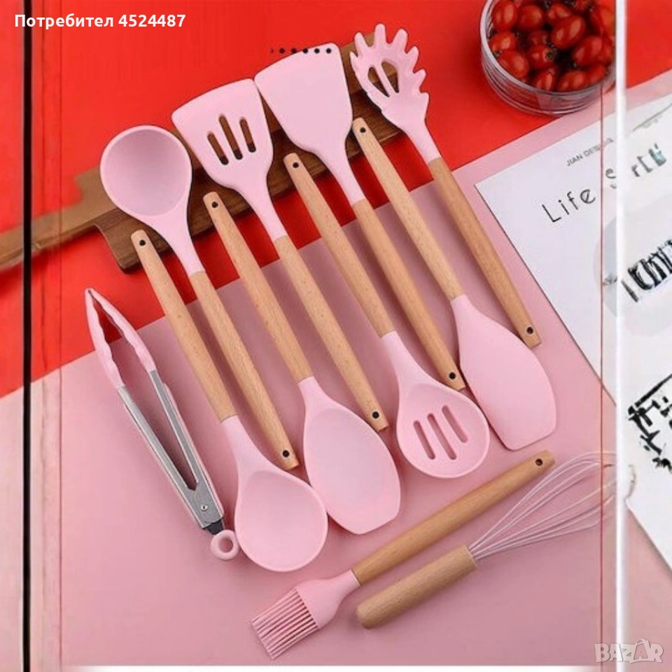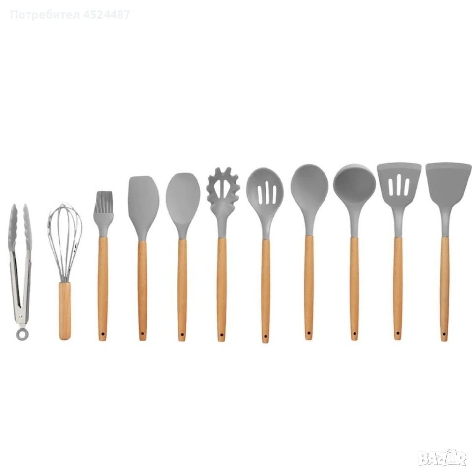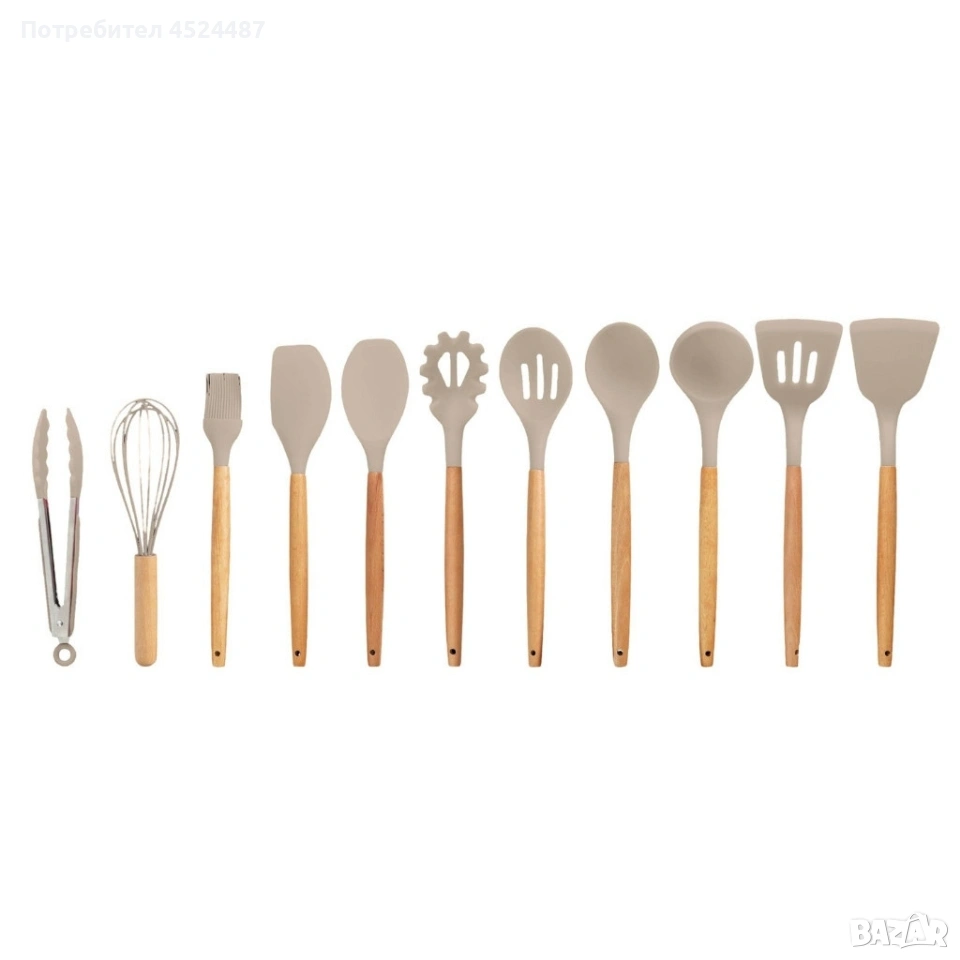 Включени прибори: плътна шпатула, перфорирана шпатула, черпак, плътна лъжица, решетъчна лъжица, прибор за спагети, кръгла шпатула, шпатула за печене, четка за мазане, тел за разбиване, кухненска щипка;