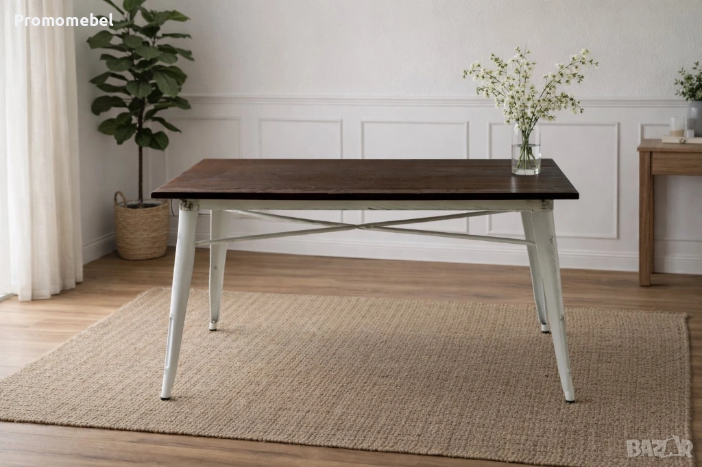 Трапезна маса от масив и боядисан метал в състарен бял цвят → Обява 53593977
