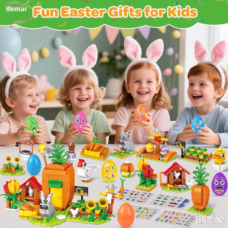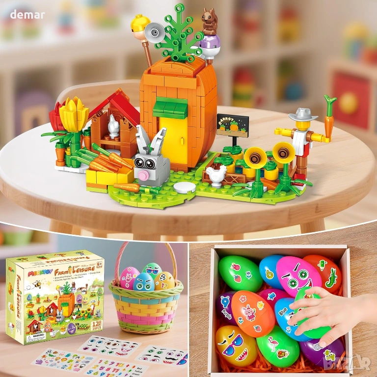 Комплектът включва 12 цветни предварително напълнени великденски яйца с тематични листове стикери и декоративна рафия трева за персонализирани изненади, които не са бонбони, заедно с колекция от 12-в-1 строителни блокчета за ферма за зайци, включваща мини модели като кладенец, кокошарник, заек, цветя, зеленчуци и пилета, които могат да бъдат сглобявани поотделно или комбинирани в по-голяма фермерска сцена. Проектиран за великденски кошници, лов на яйца, подаръци за парти и награди в класната стая, комплектът насърчава въображаемото разказване на истории, практическото конструиране и интерактивната игра. Като STEM-фокусирана дейност, той подкрепя фината моторика, креативността, търпението и решаването на проблеми, като същевременно осигурява многократно използваемо сезонно забавление. Изработен от издръжлива, нетоксична ABS пластмаса с гладки ръбове и съвместим с основните марки строителни блокчета, той предлага безопасно, подходящо за деца и висококачествено игрово изживяване с включени лесни за следване инструкции.