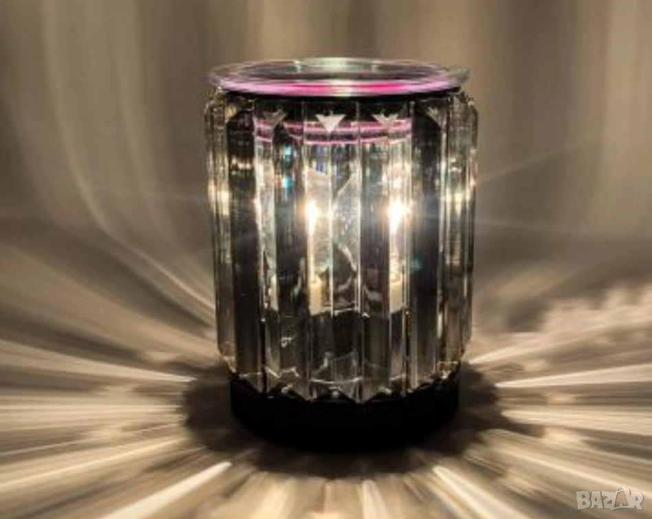 Изработена от висококачествен кристален материал (K9) с фасетирани елементи, които пречупват светлината, допълнени от метални части с хромирано покритие.
