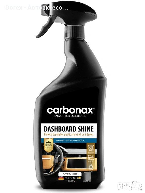 Придайте нов живот на таблото и вътрешните пластмасови детайли с професионална формула за блясък и защита. CARBONAX® Dashboard Shine почиства прах и замърсявания, възстановява наситения цвят и създава защитен слой срещу избеляване, напукване и UV лъчи.