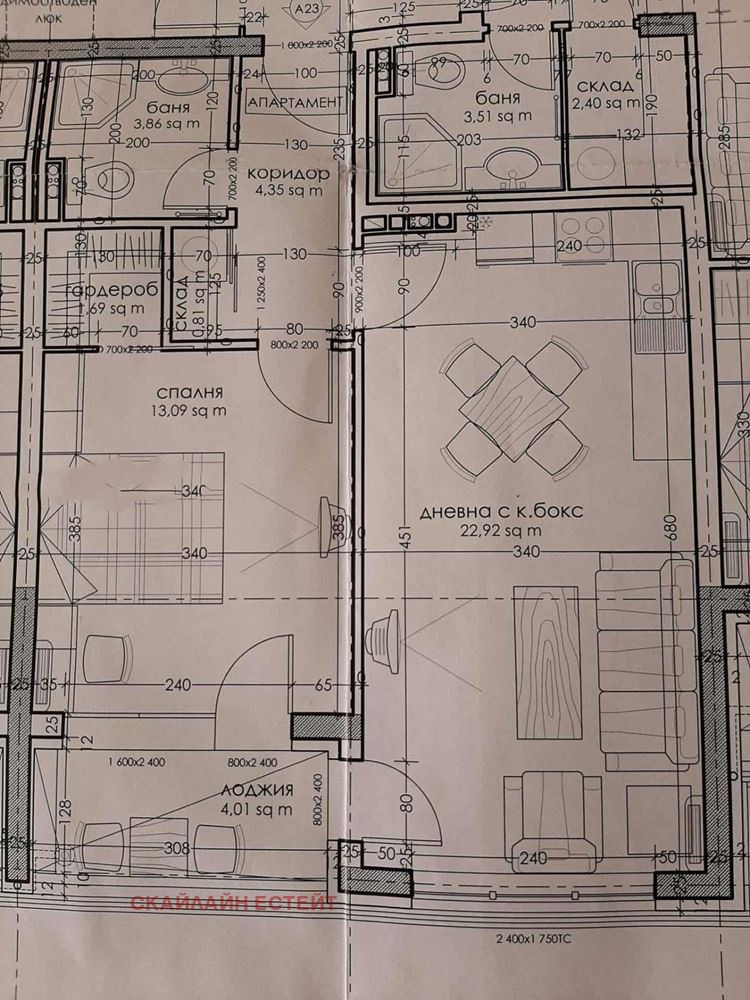 🗺️ Разпределение: антре; баня с тоалетна; склад; просторна всекидневна, организирана на зони кухня, хол и трапезария; спалня с дрешник
