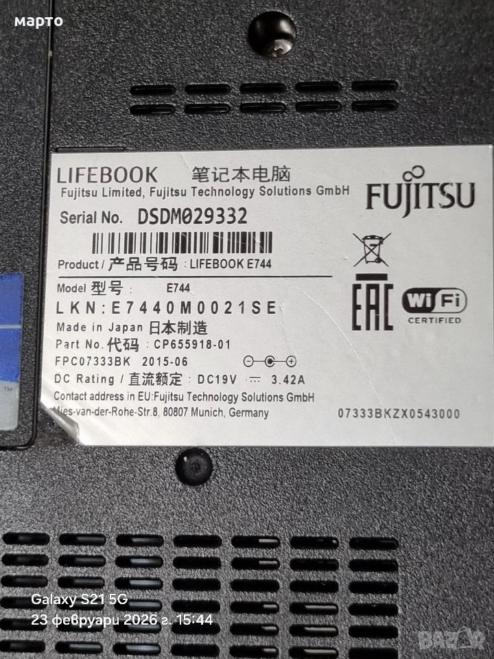 Fujitsu Lifebook E744 в перфектно състояние хард 500гб рам 8гб батерията държи над 2 часа оригинално зарядно в комплекта